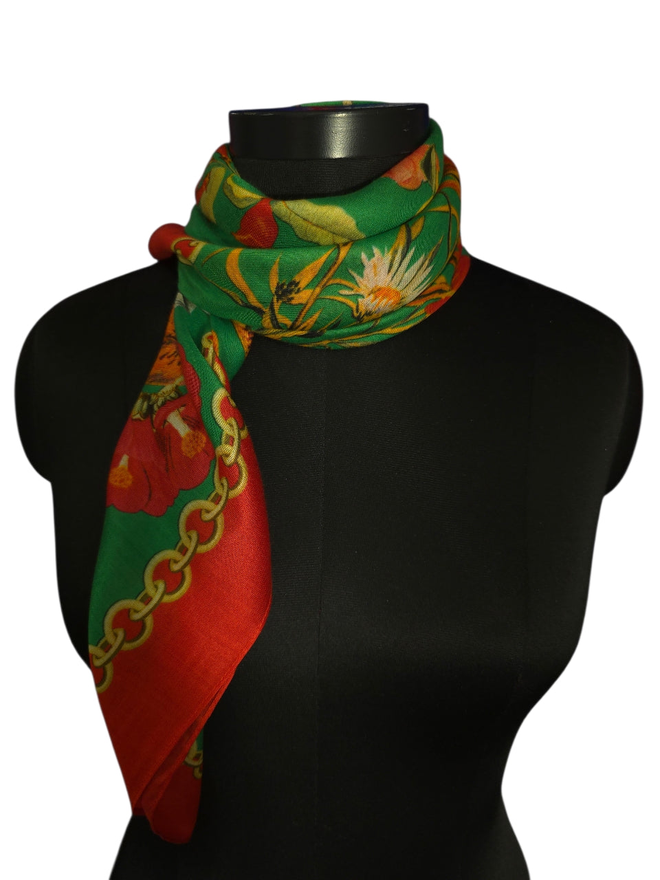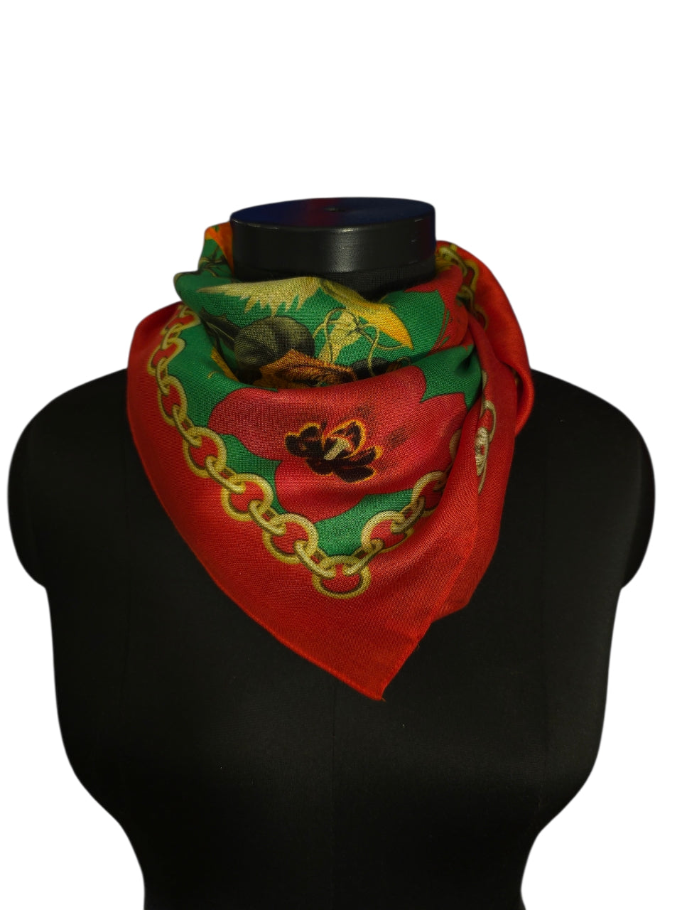 ​En delikat gullfarget kjedekant rammer inn det botaniske motivet, som er kantet med en bred, dyp rød stripe, noe som gir skjerfet en luksuriøs og definert finish.
