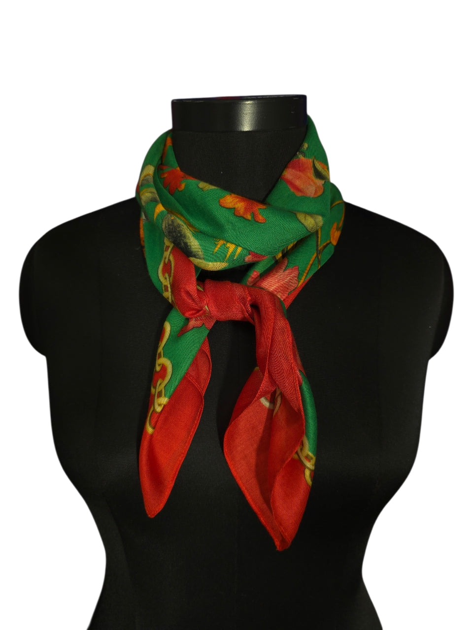 Trå inn i en verden av fargerik og sofistikert skjønnhet. Dette eksklusive skjerfet i 100 % ren silke er en hyllest til naturens egen prakt, presentert i en klassisk og tidløs komposisjon. Mot den dype, smaragdgrønne bakgrunnen folder det seg ut et intrikat mønster av delikate blomster i brent oransje, solgult, korallrødt og nøytralt hvitt.