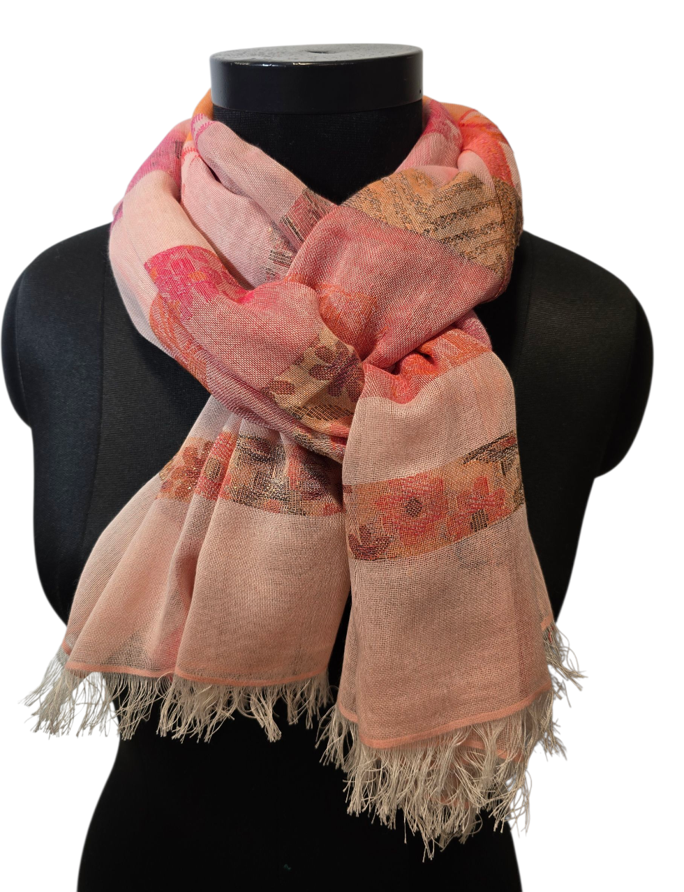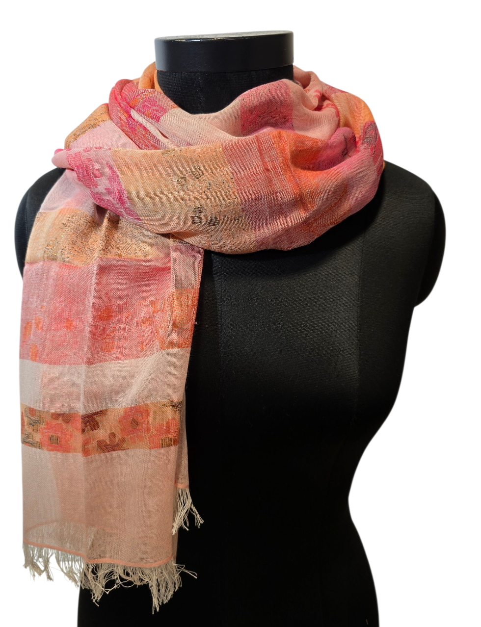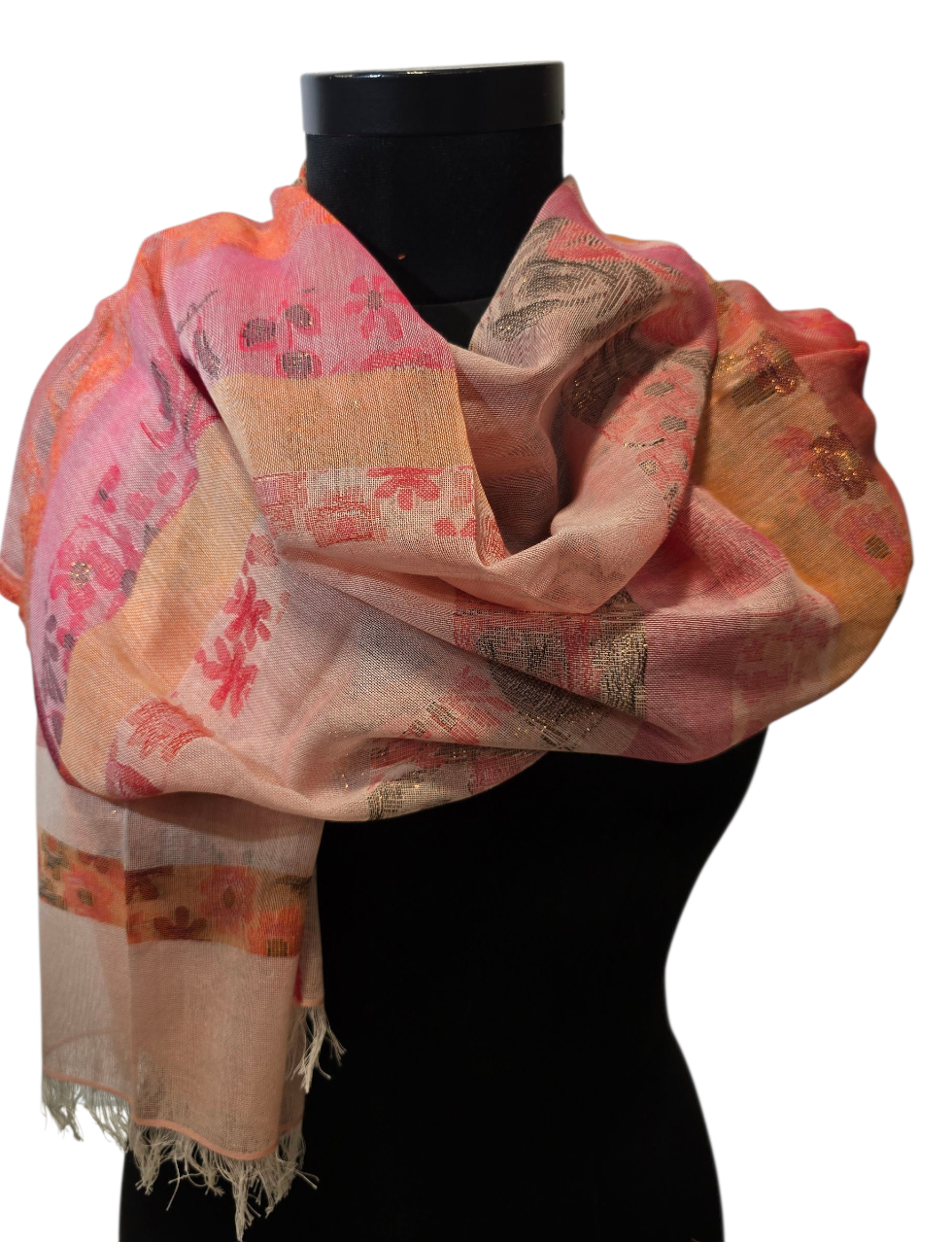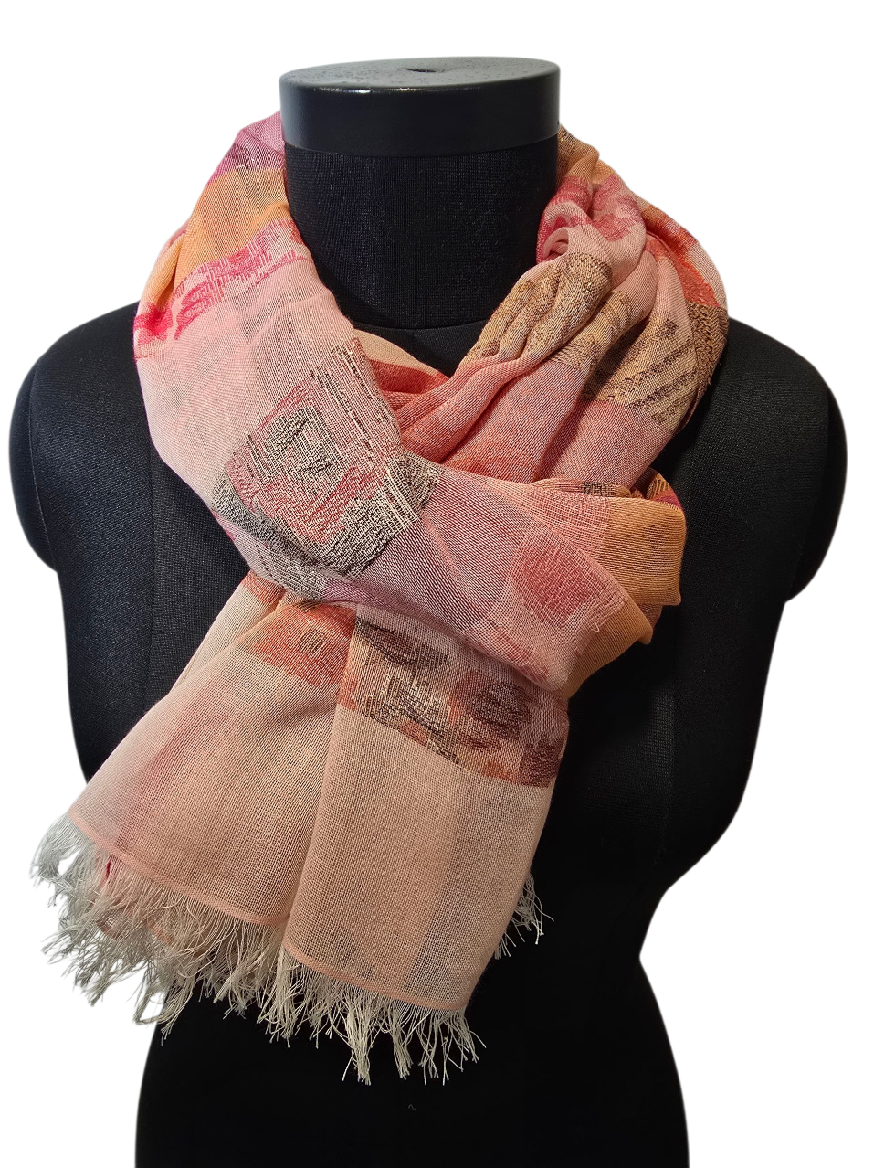 Fersken og rosafarget bomullsskjerf med gylne detaljer (078)