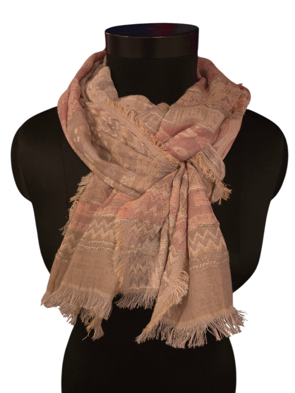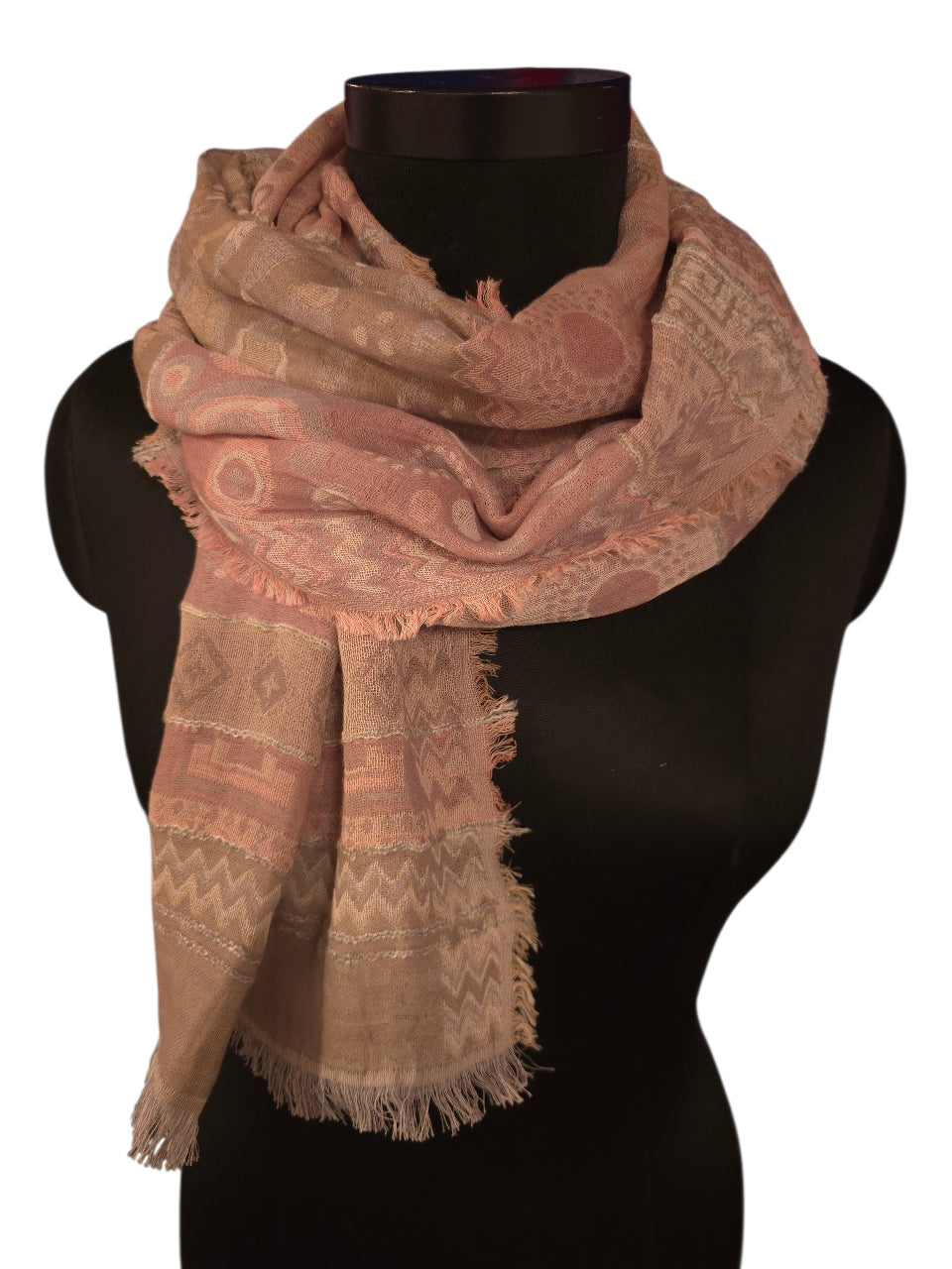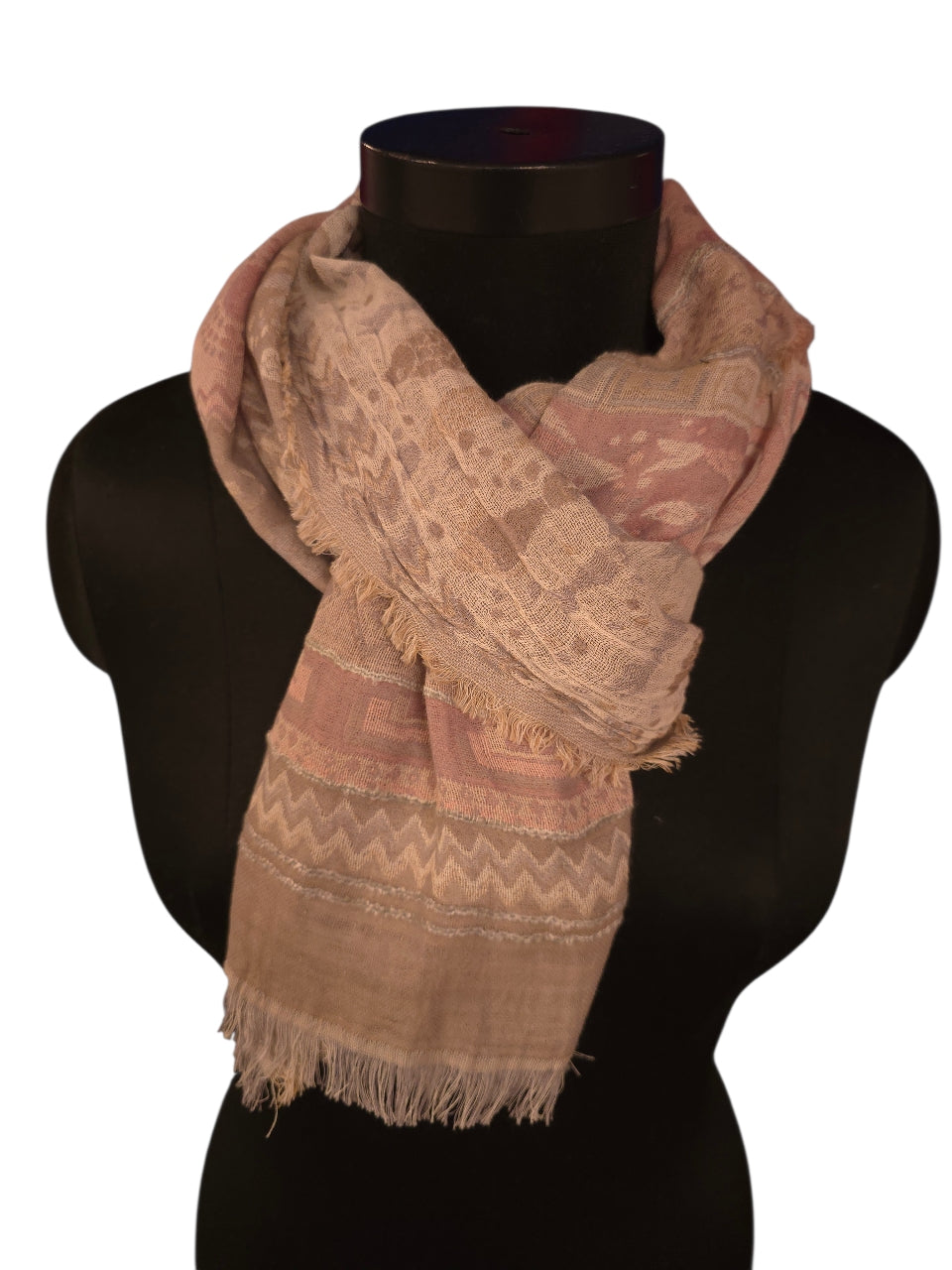 Sprekt og lett skjerf i bomull og silke. Vevet med et rolig mønster og farger.