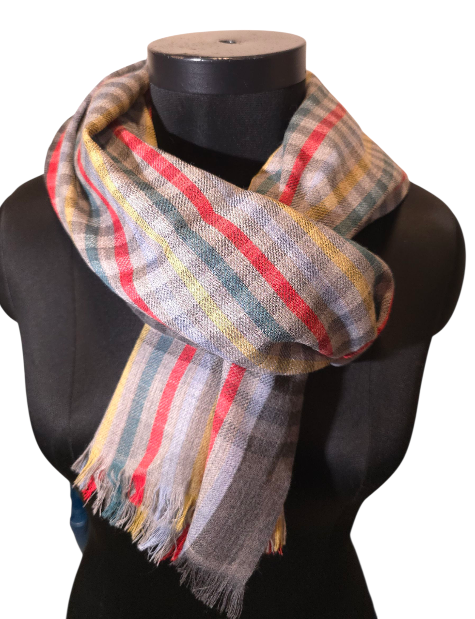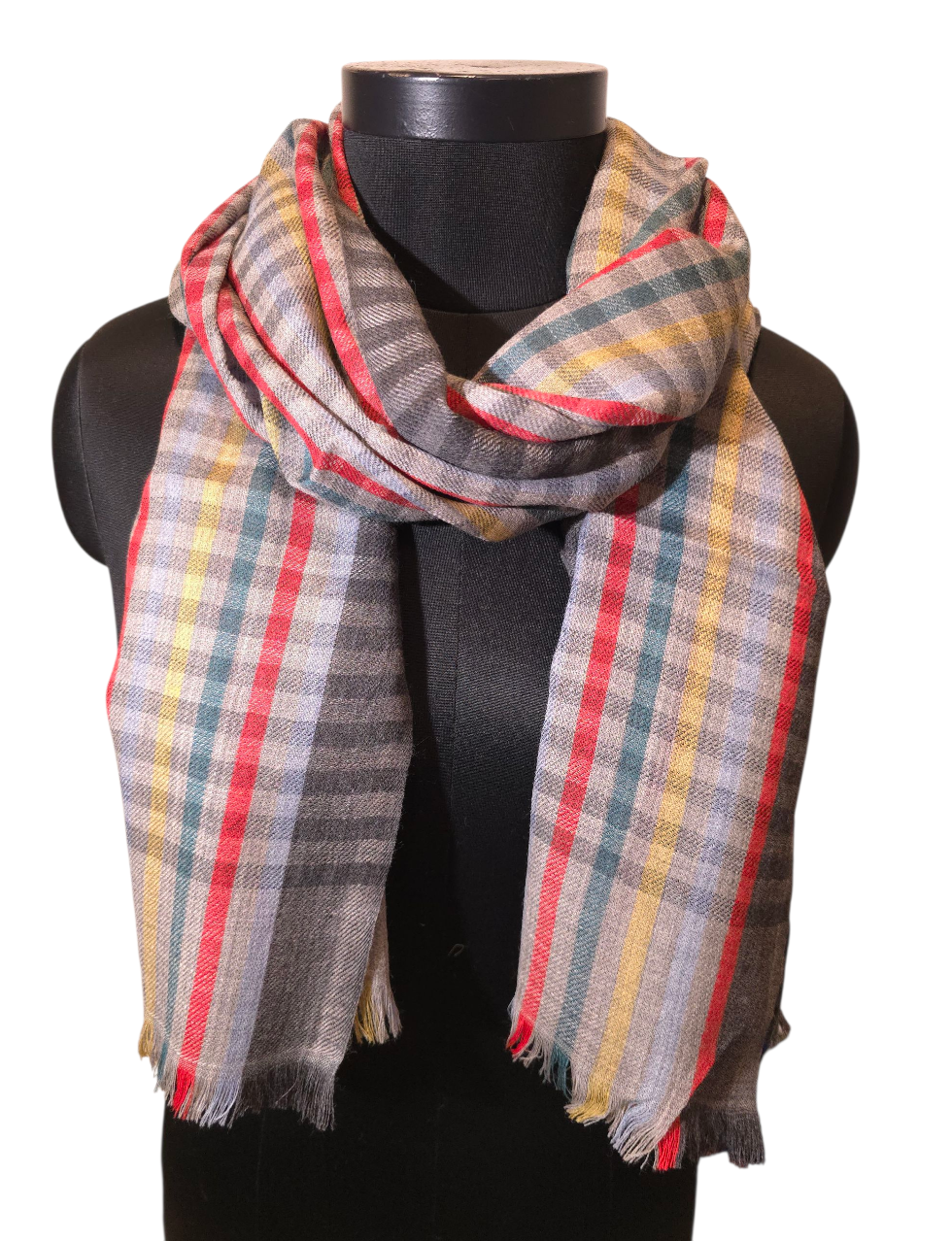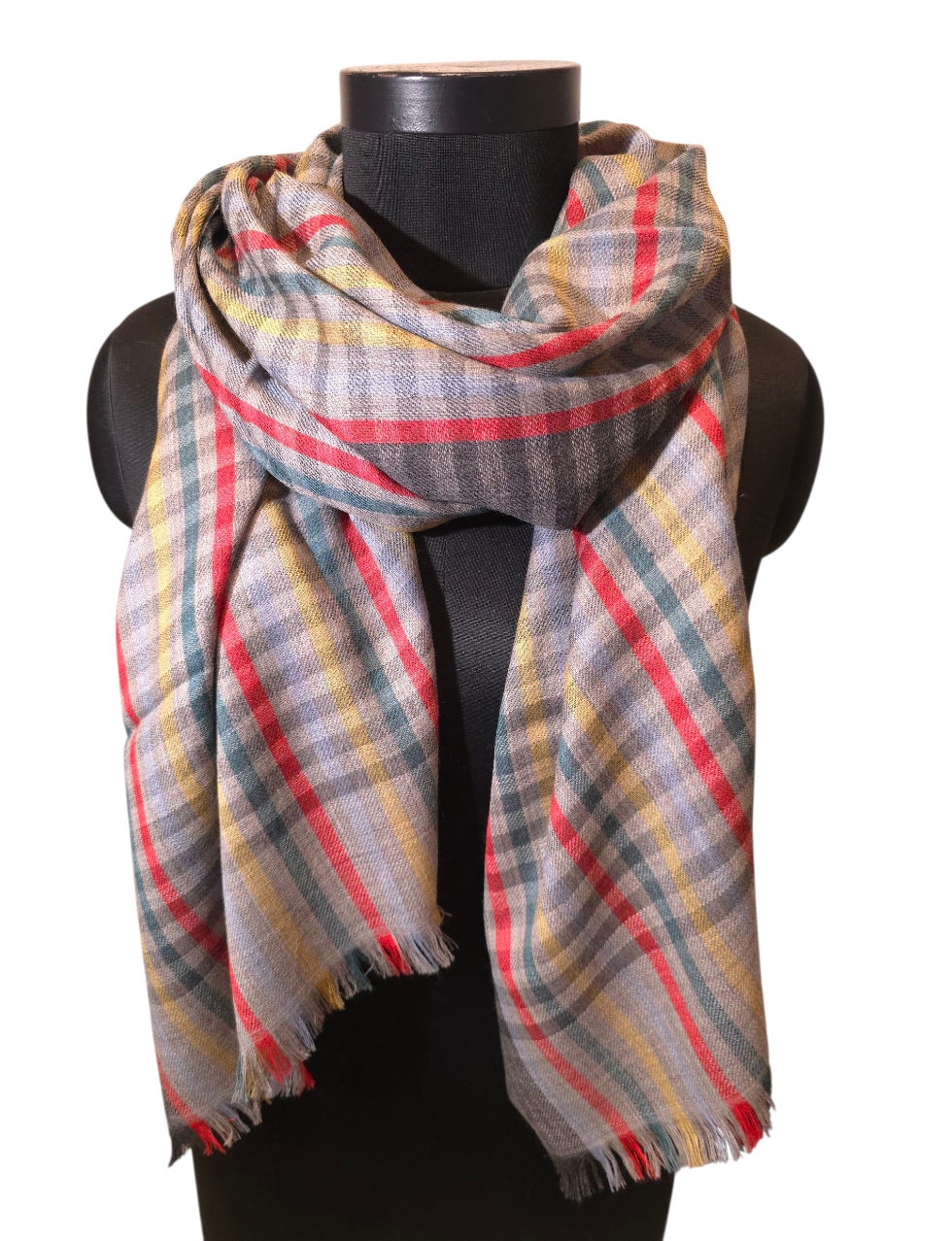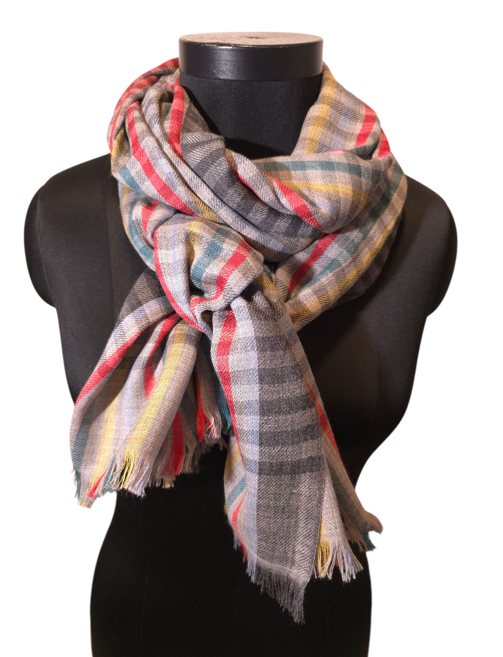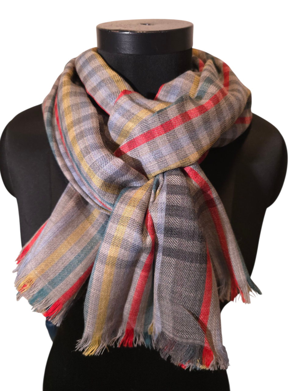Grå rutete skjerf i ren ull med røde, gule, lavendel og grønne striper (76)