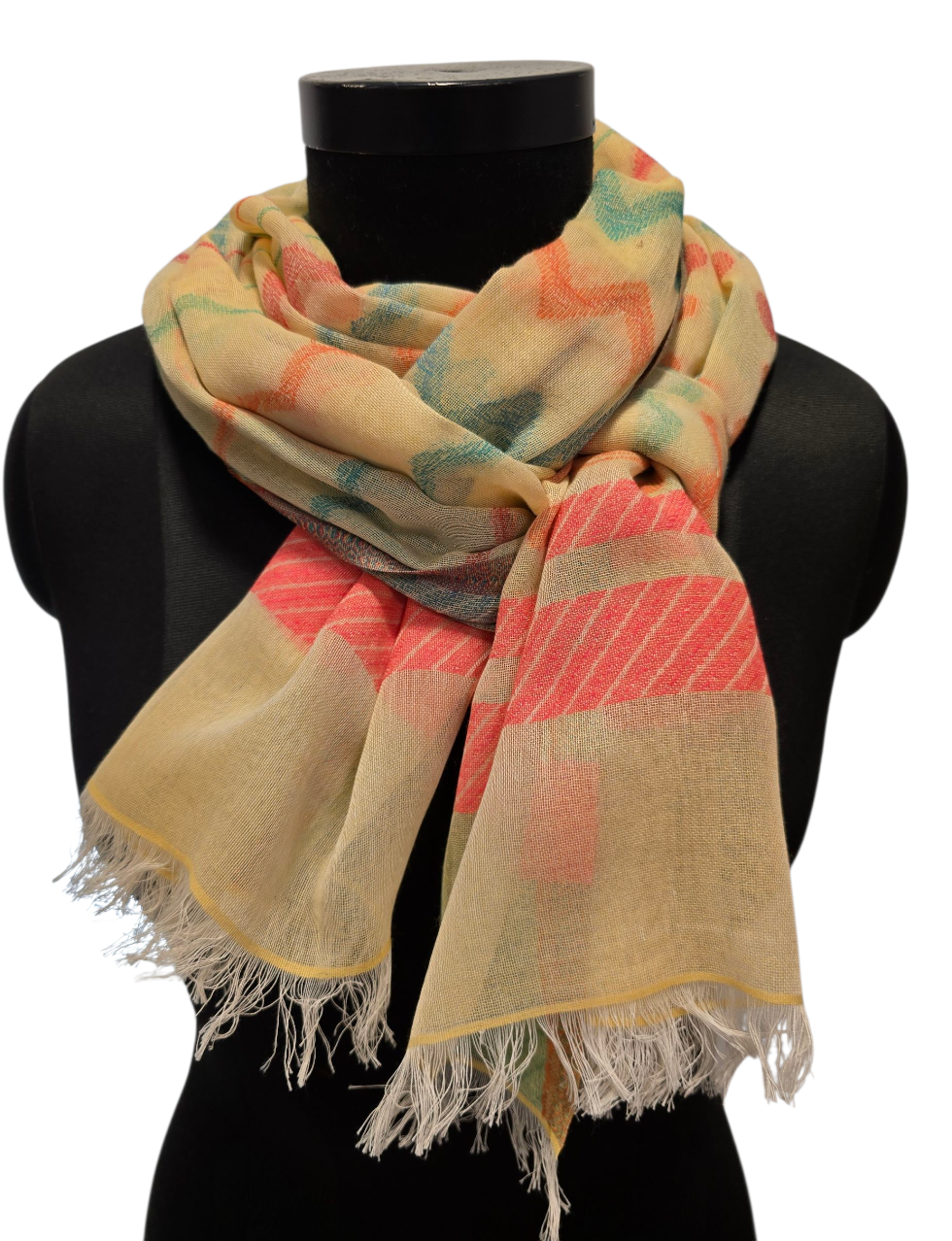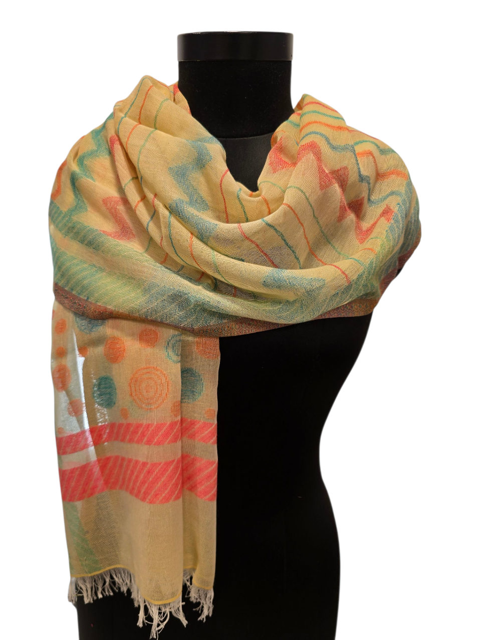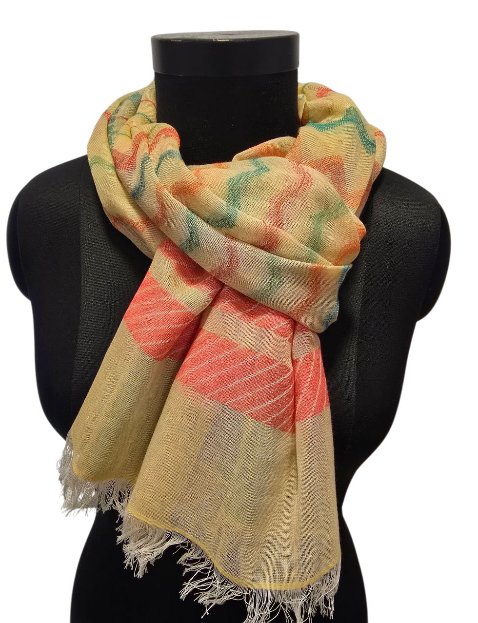 Luftig smørgult skjerf med flotte vevde mønster (087)