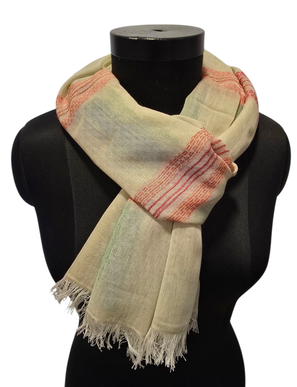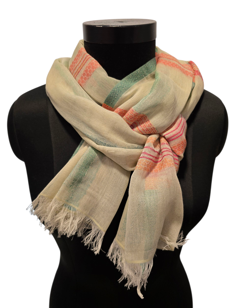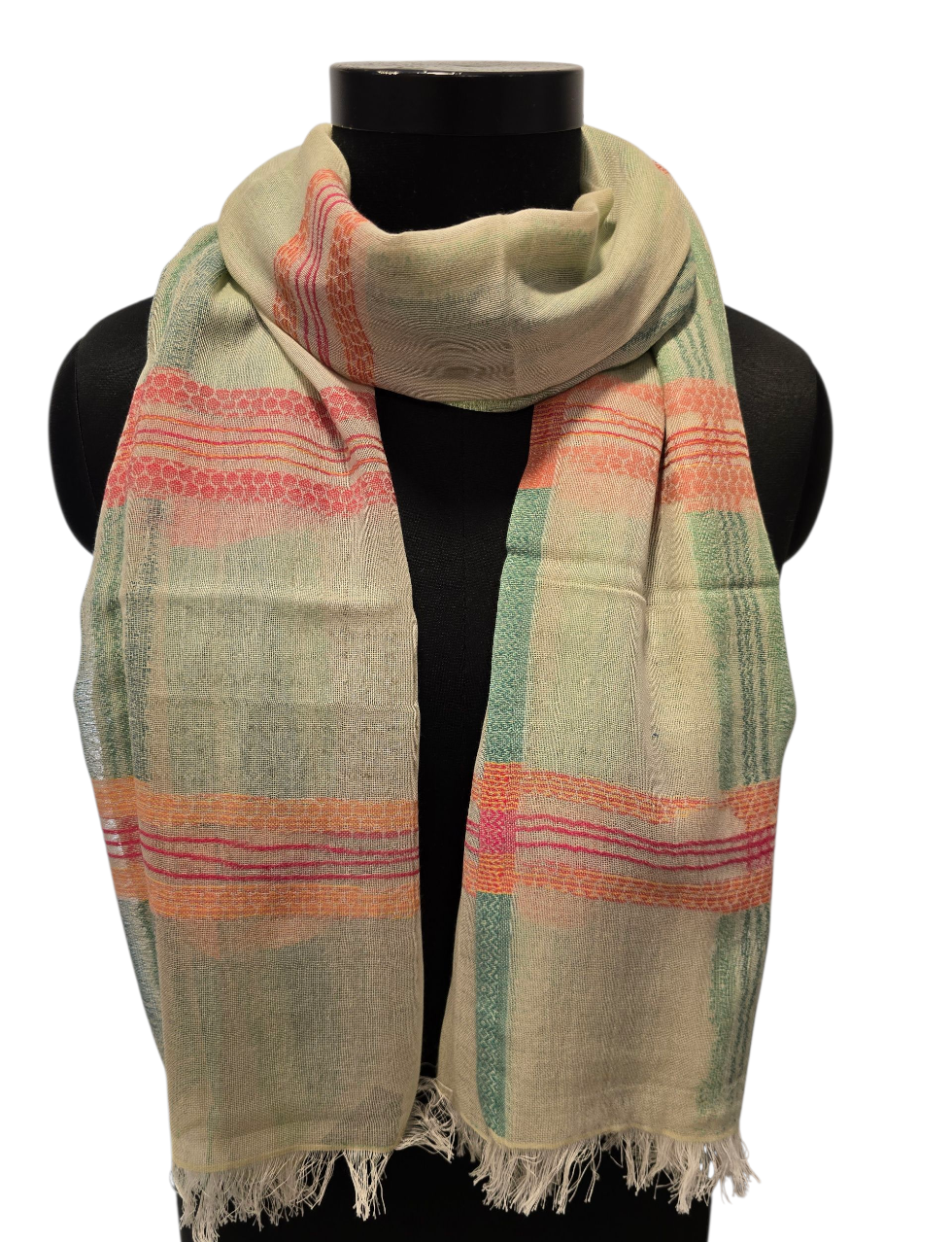 Et meget mykt og godt skjerf i undertoner av mint med rosa og grønne striper.