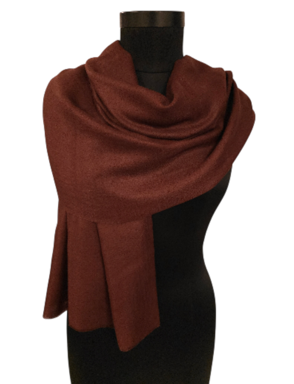 Et elegant ensfarget brunt pashmina skjerf/sjal. Bruken bestemmer vel navnet.