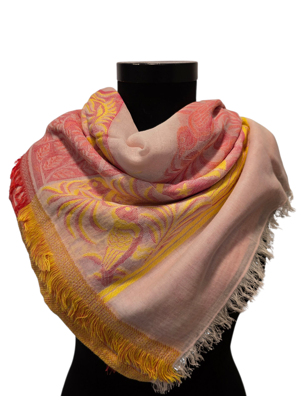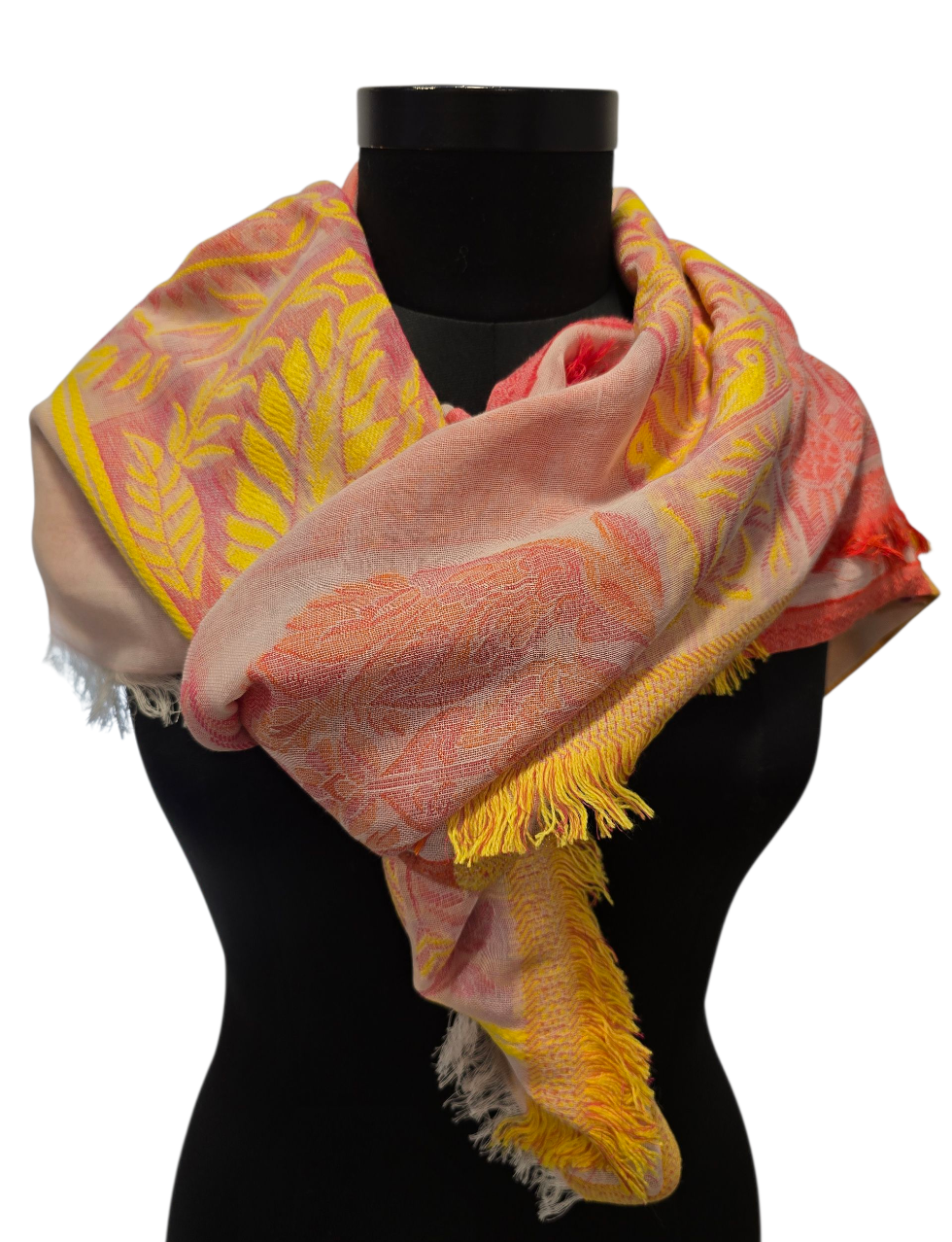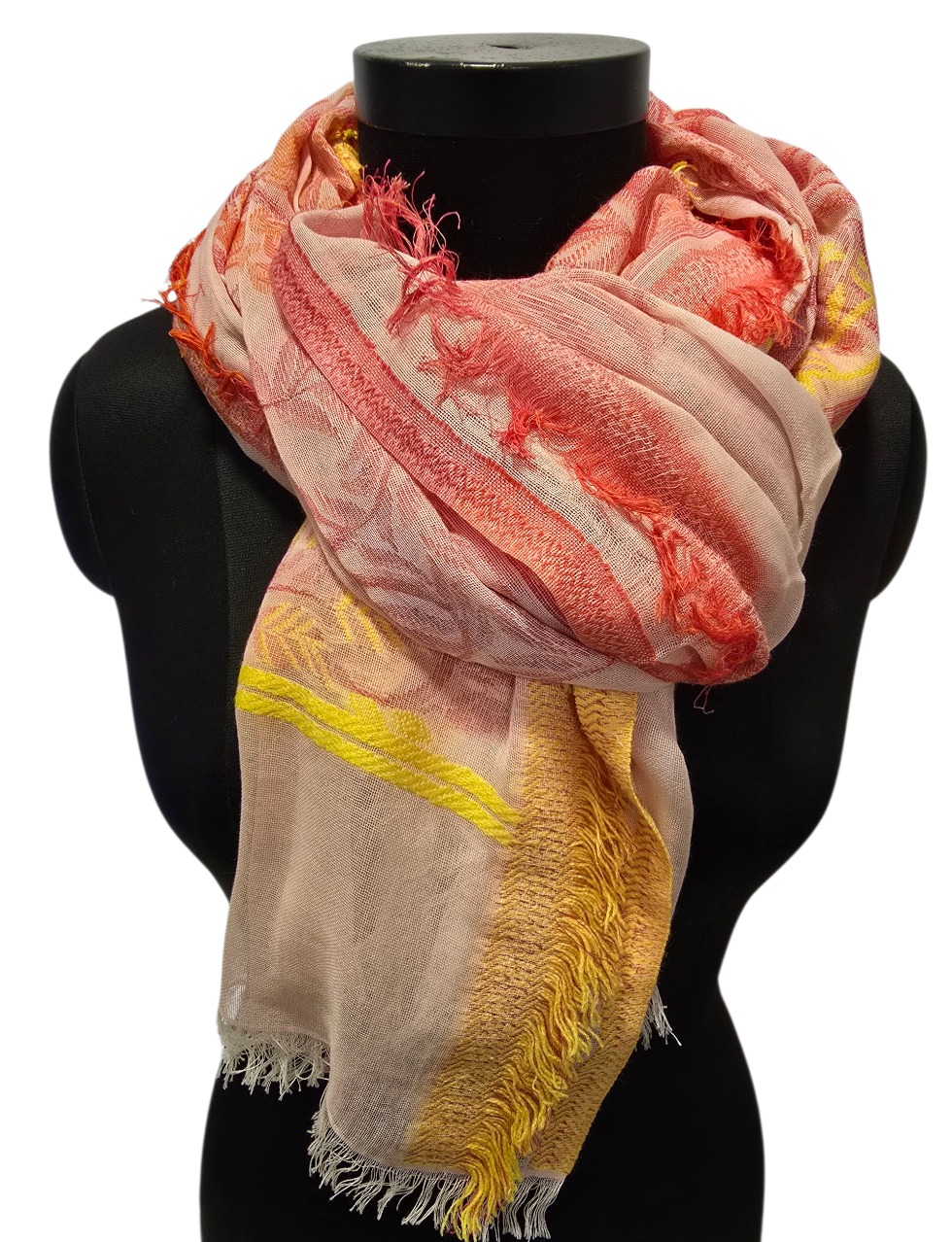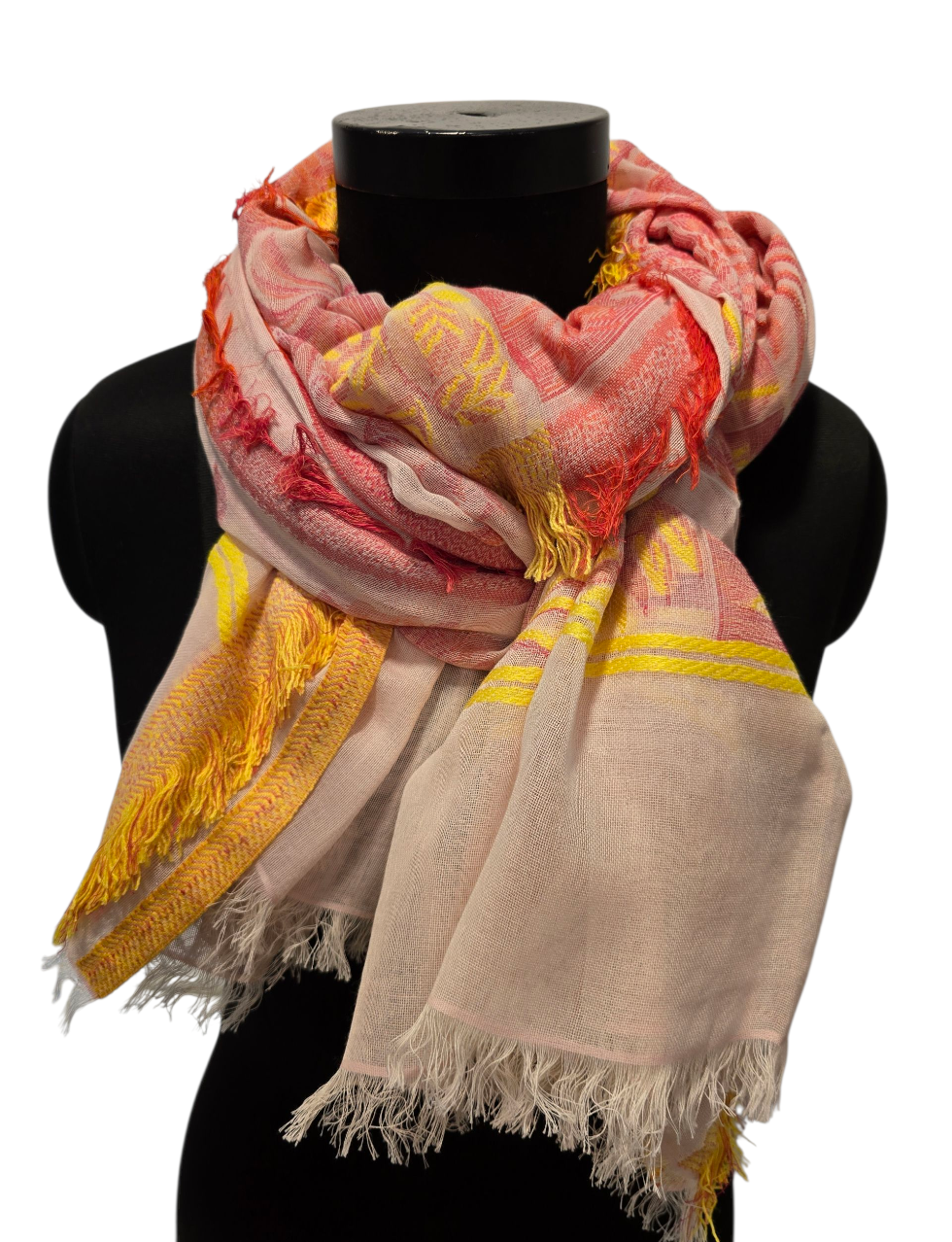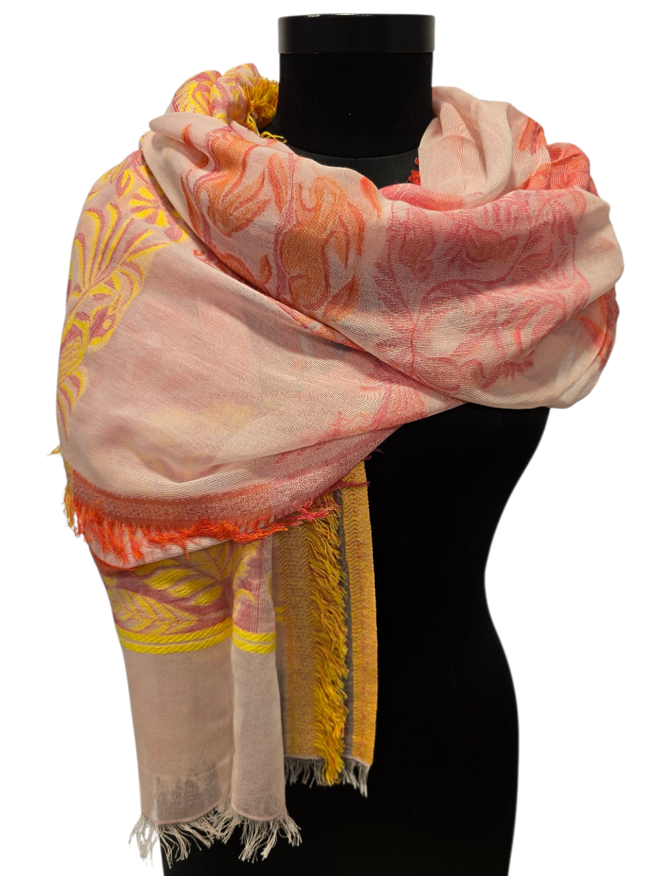 Sjalet er ca 100x200 cm stort. Produsert i Delhi, India.