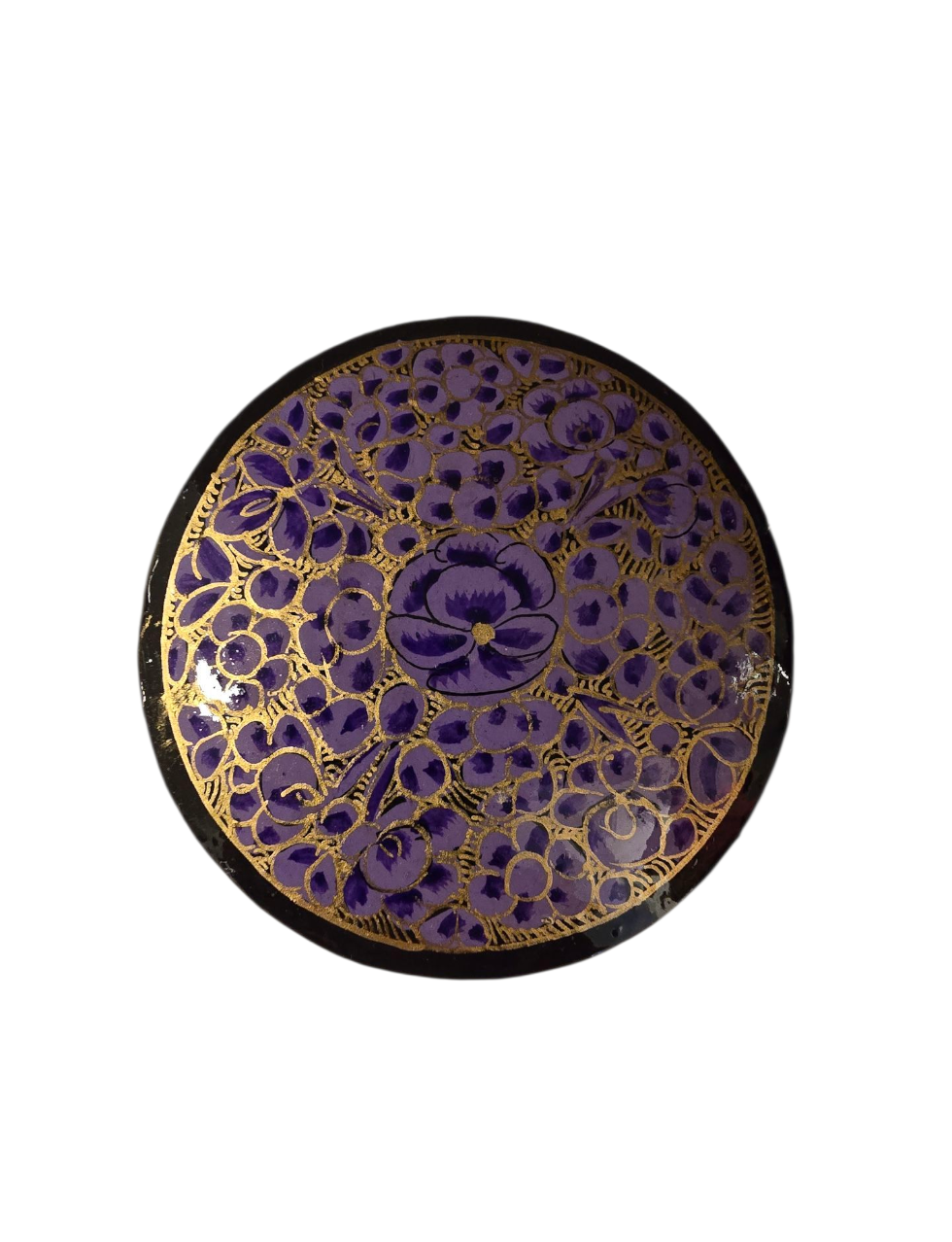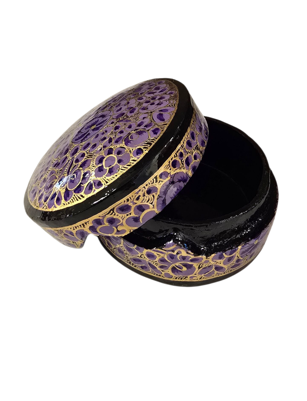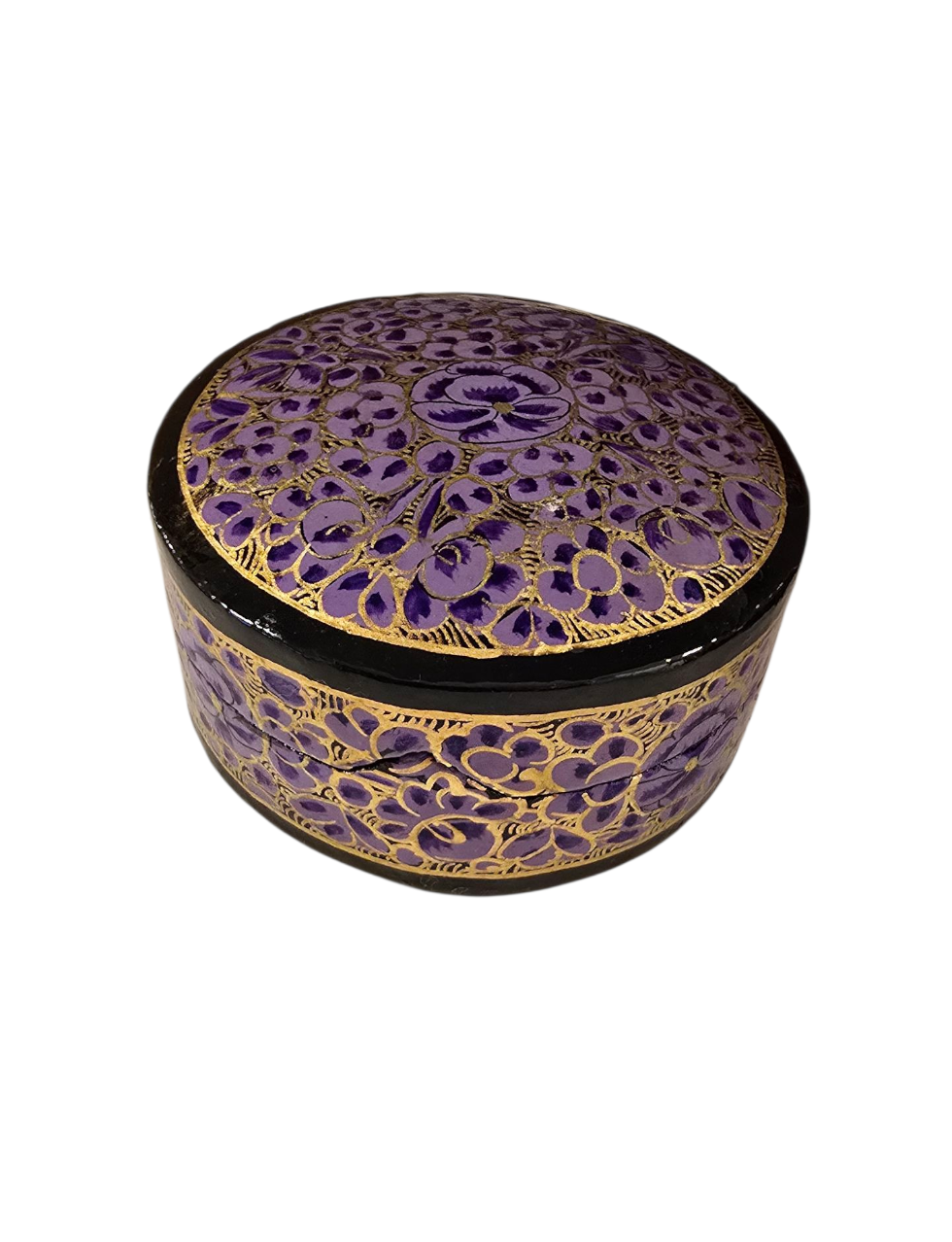 En nydelig fargerik liten rund boks til oppbevaring av noe du er glad i. Håndmalt i lilla, sort og gylne farger.