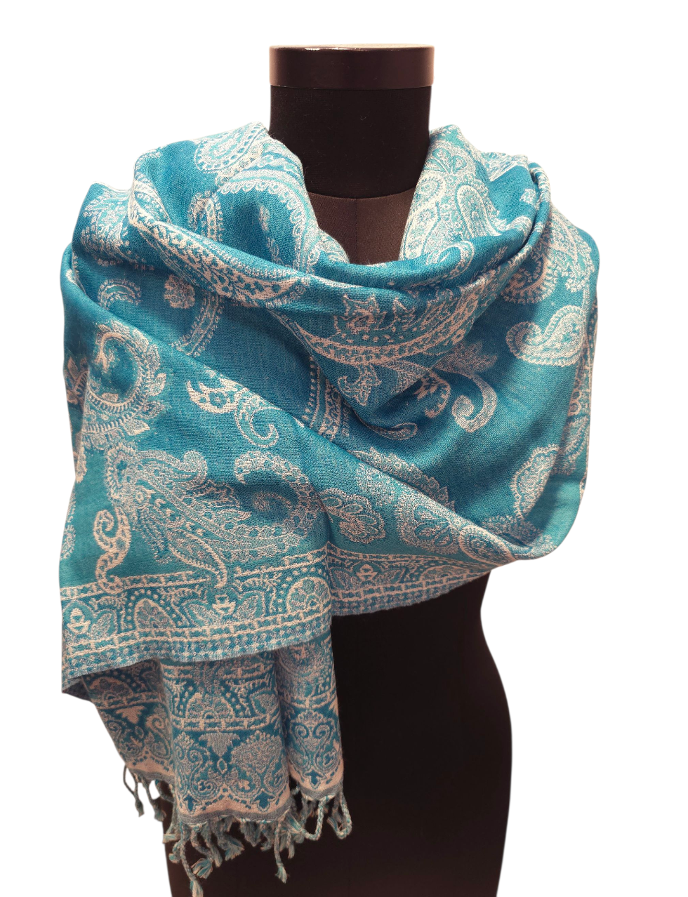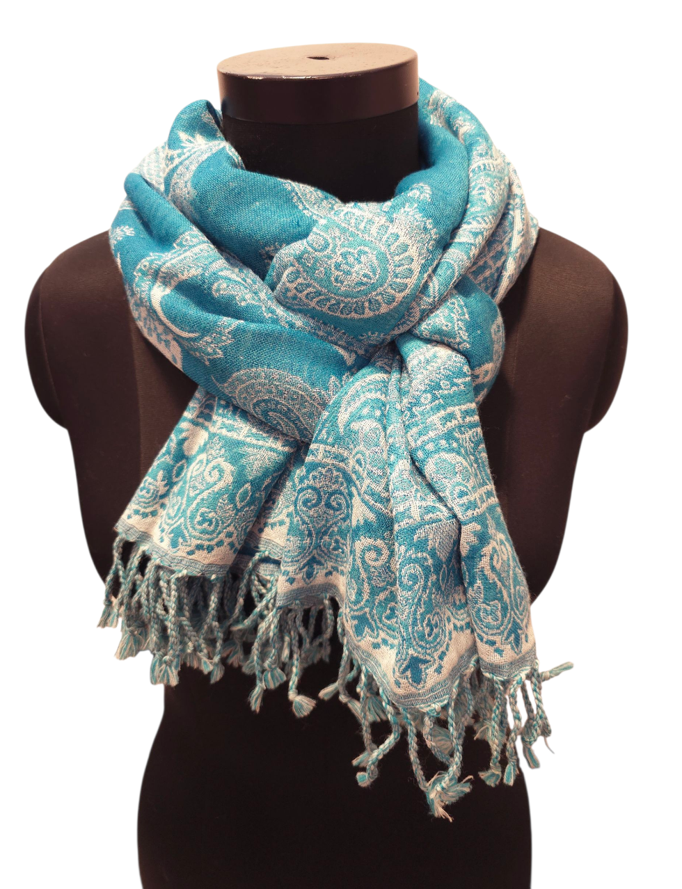 Mykt og godt skjerf i en lys blå og offwhite farge.