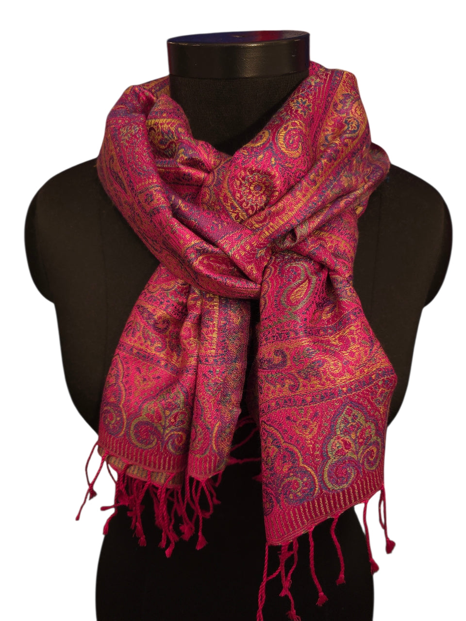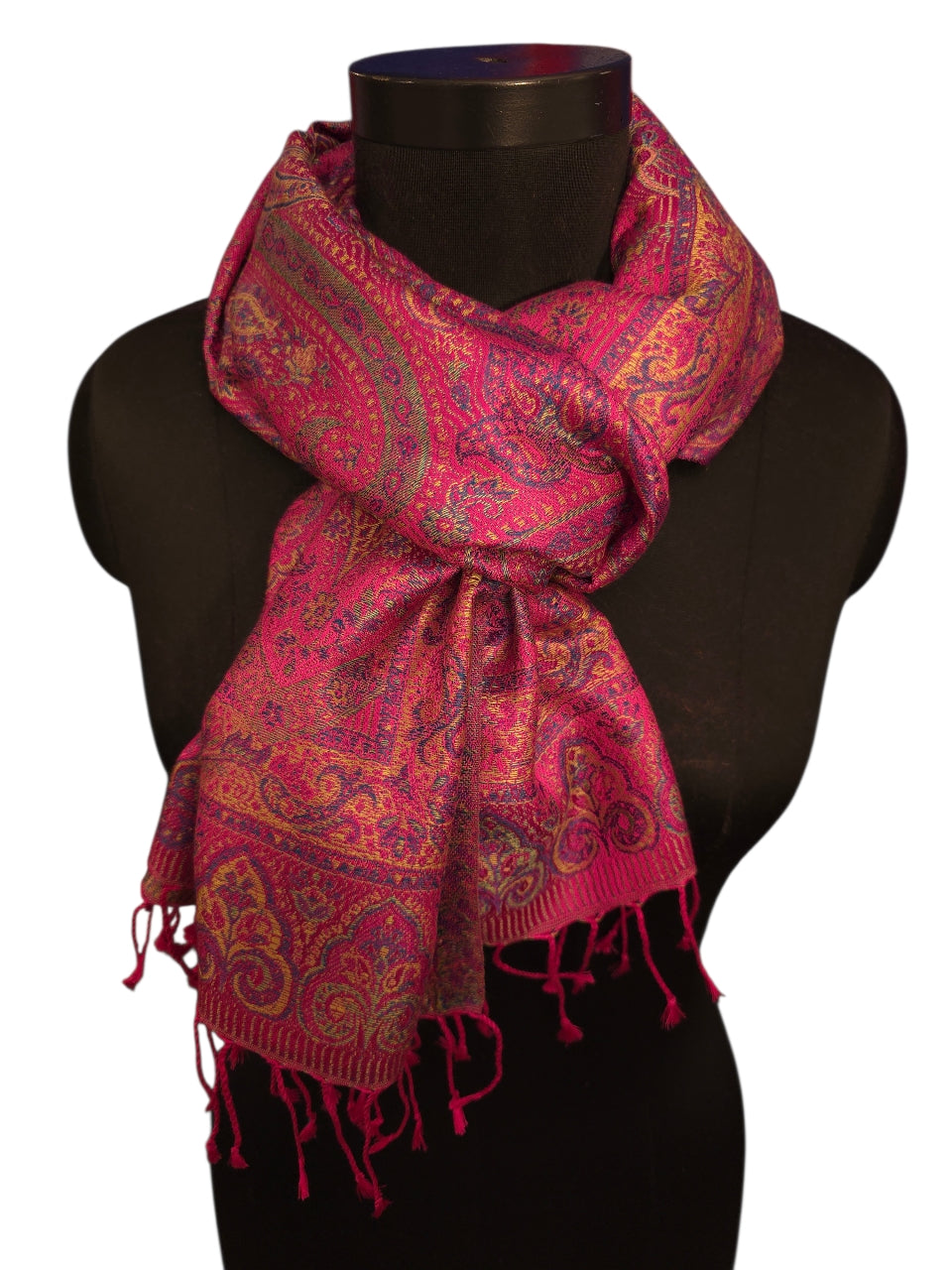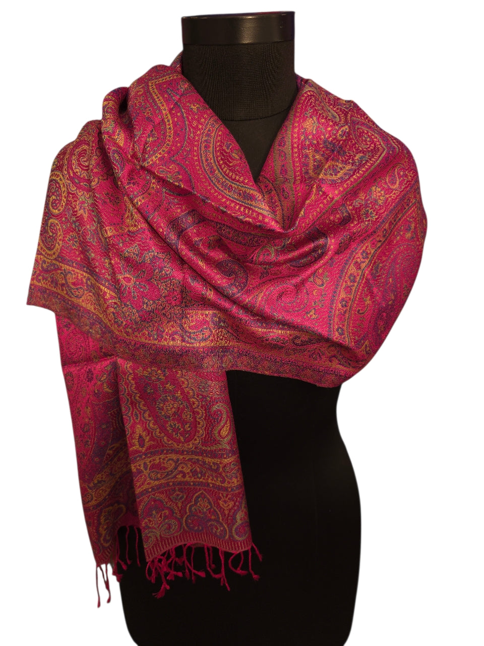 Dette luksuriøse skjerfet i 100 % ekte silke er et sant blikkfang med sitt rike paisleymønster i dype magentatoner. Med målene 50x180 cm faller det vakkert og gir en sofistikert eleganse til ethvert antrekk. Silken føles sval mot huden og gir en naturlig glans som oser av kvalitet.