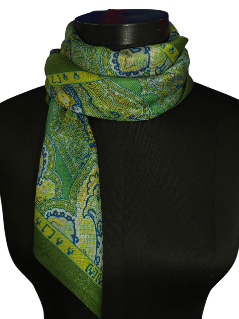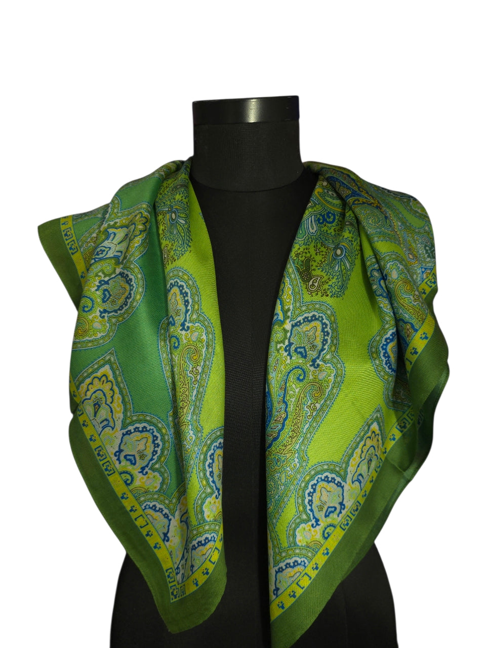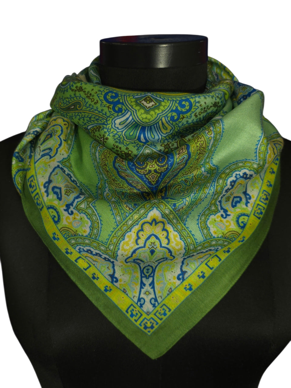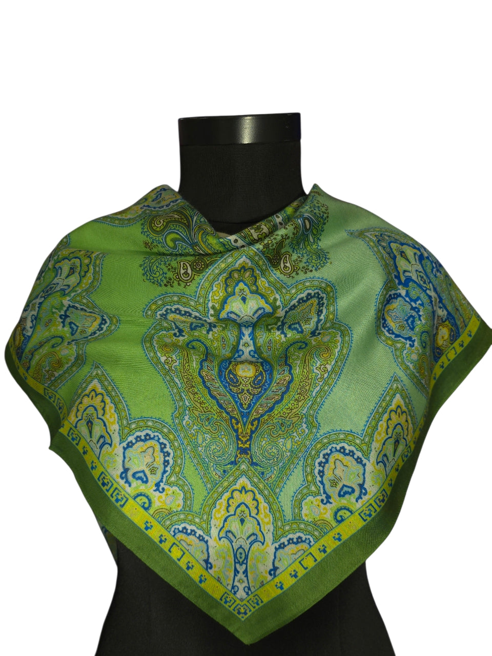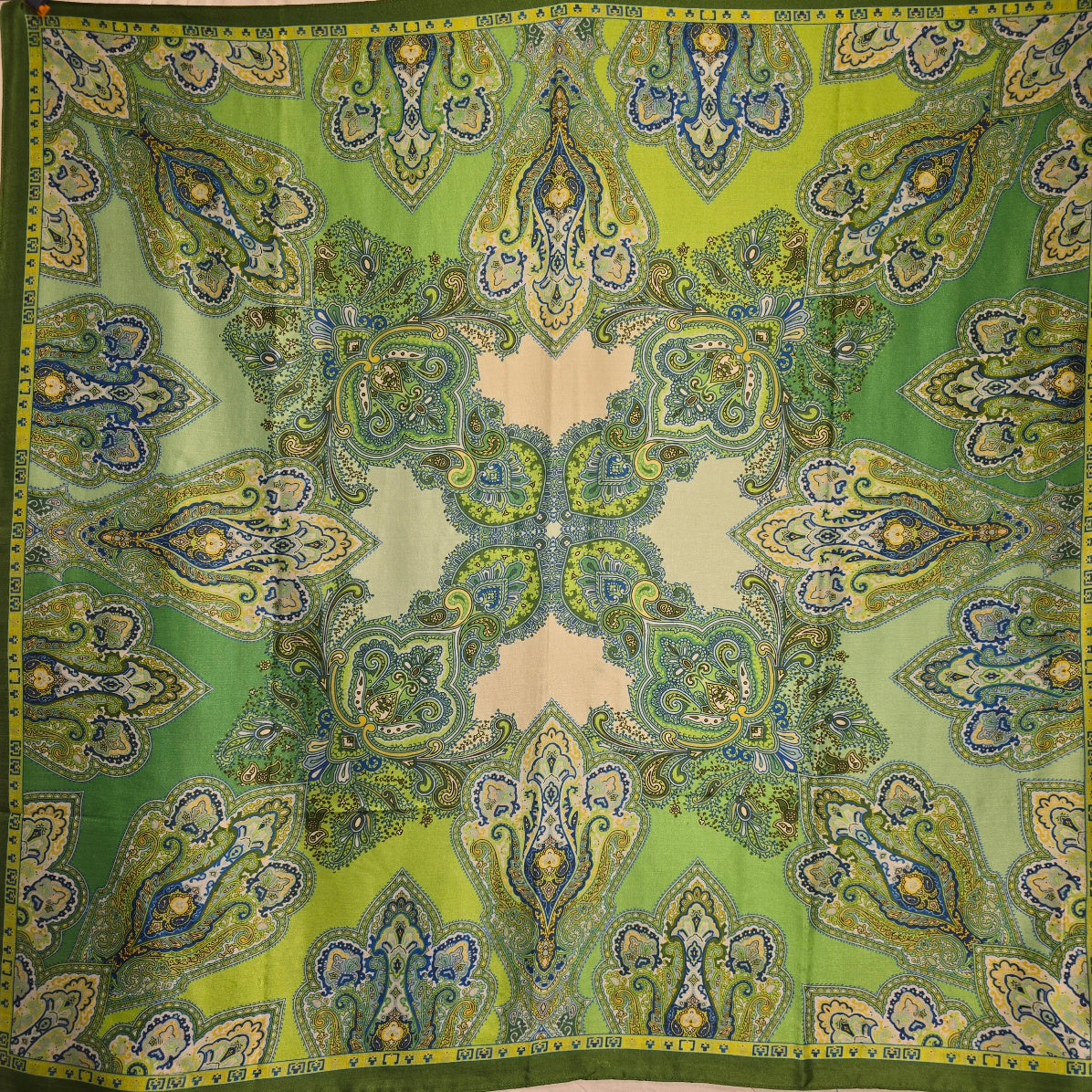 Opplev den perfekte balansen mellom klassisk mønster og friske farger. Dette praktfulle skjerfet i 100 % ren silke er preget av et symmetrisk og detaljrikt paisley-design som leder tankene mot klassisk, europeisk eleganse. Paletten består av nydelige sjatteringer i limegrønt, mosegrønt og kremhvitt, med subtile detaljer i blått og gult som gir dybde til motivet.
