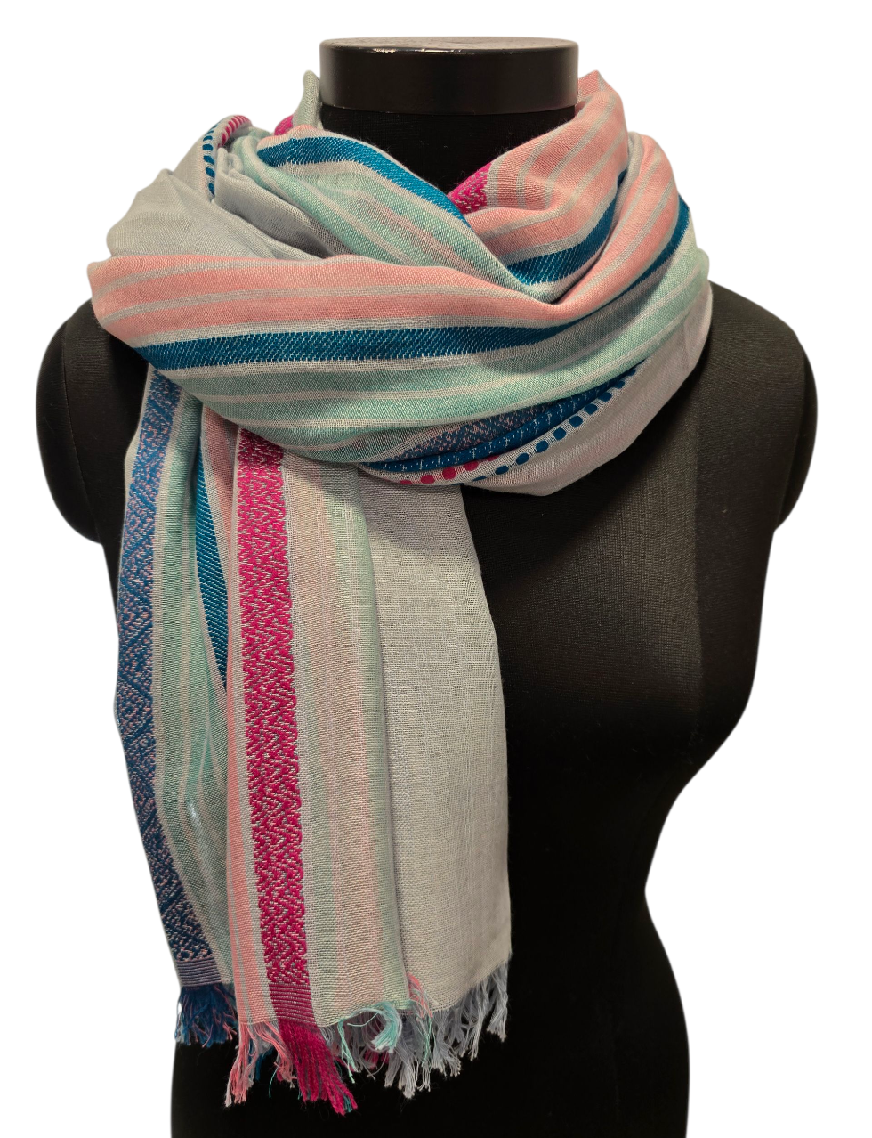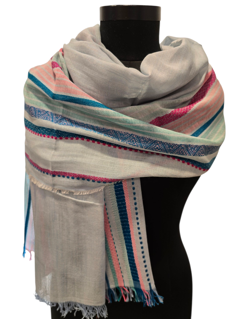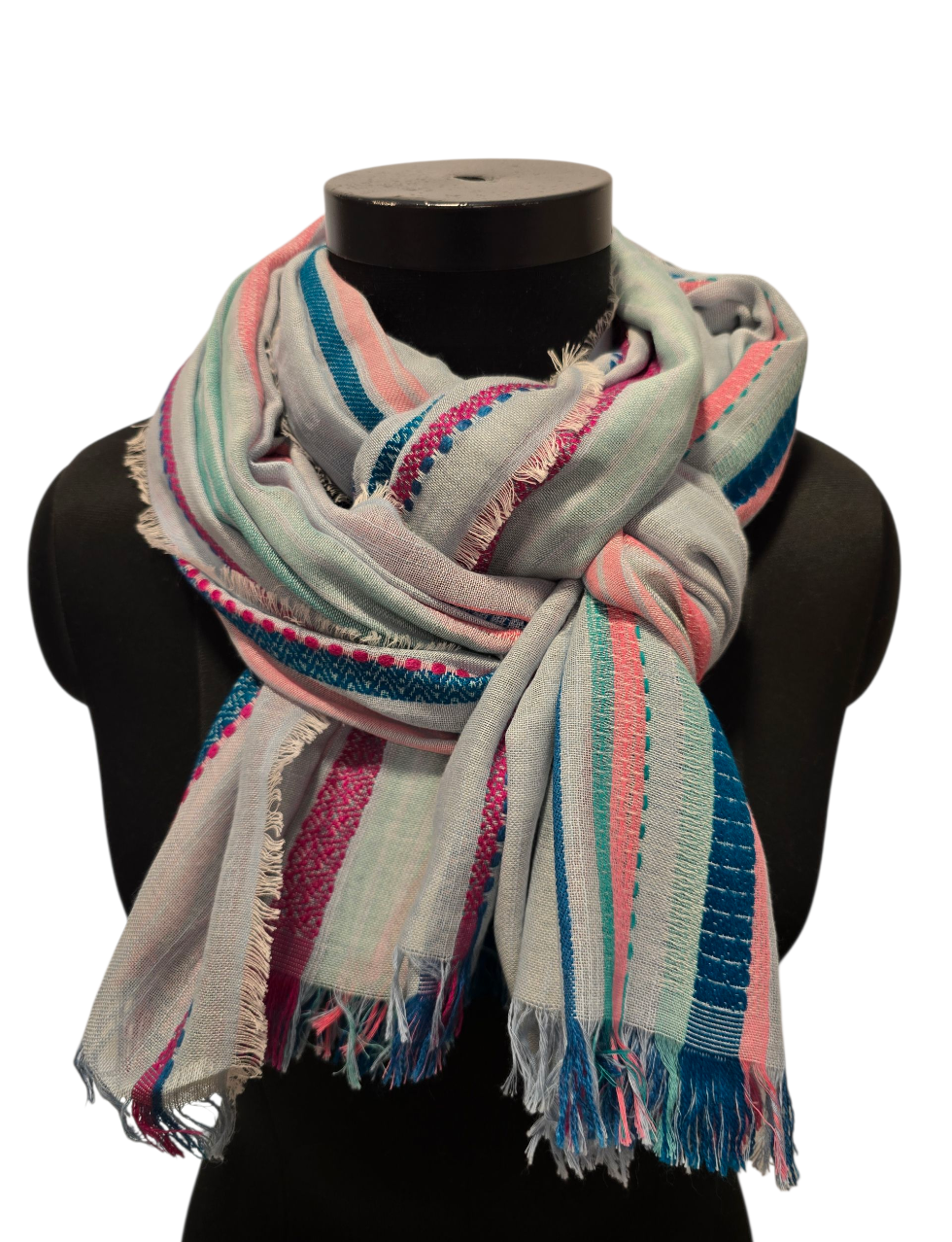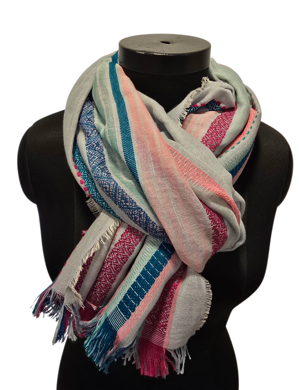 Sjalet er ca 100x180 cm stort. Produsert i Delhi, India.