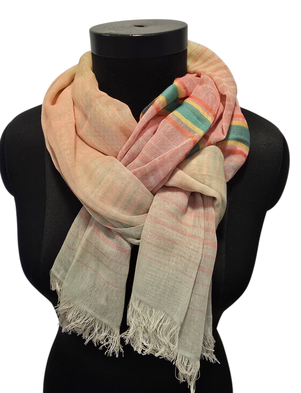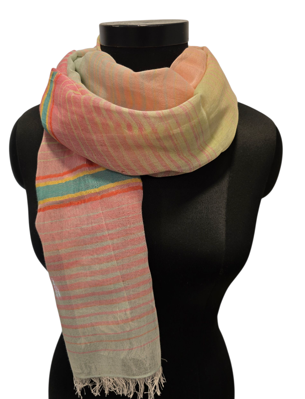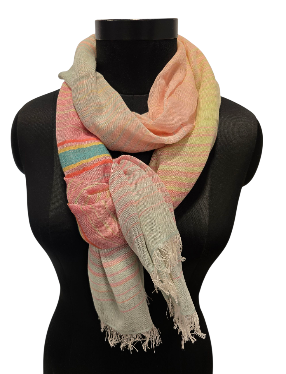Et lyst og fint skjerf med striper. Skjerfet er luftig og lett. Dette er en vareprøve og selges til en skikkelig god pris.