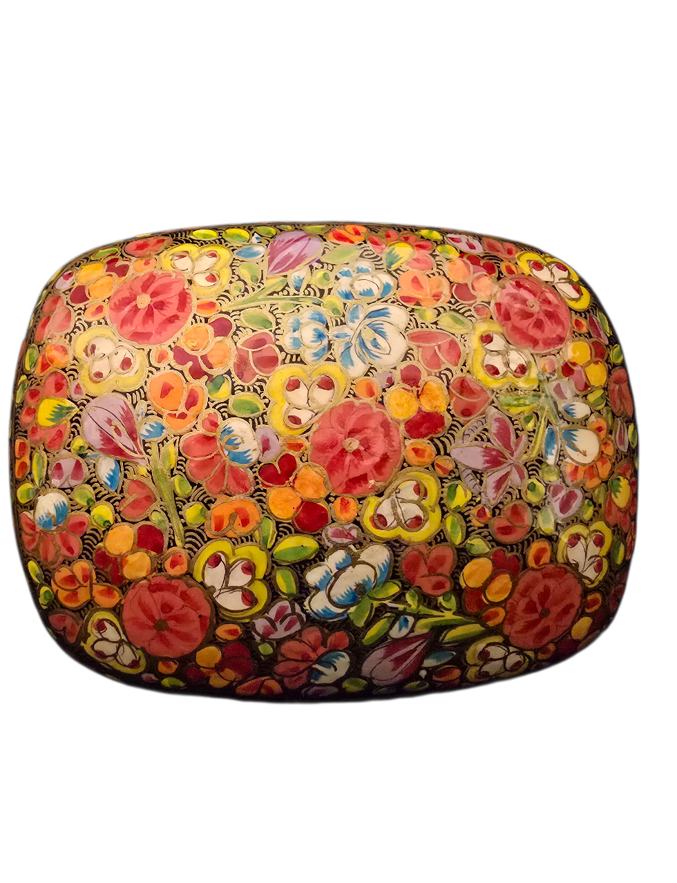 Håndlaget smykkeskrin med vakre håndmalte blomster. Skrinet er laget i pappmache, malt og lakkert for hånd.