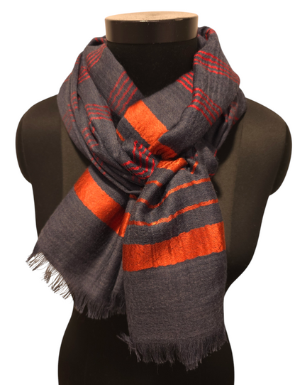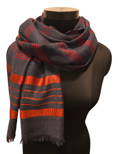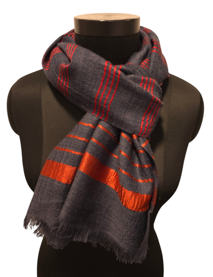 Blågrått skjerf med røde og oransje striper i silke (66)