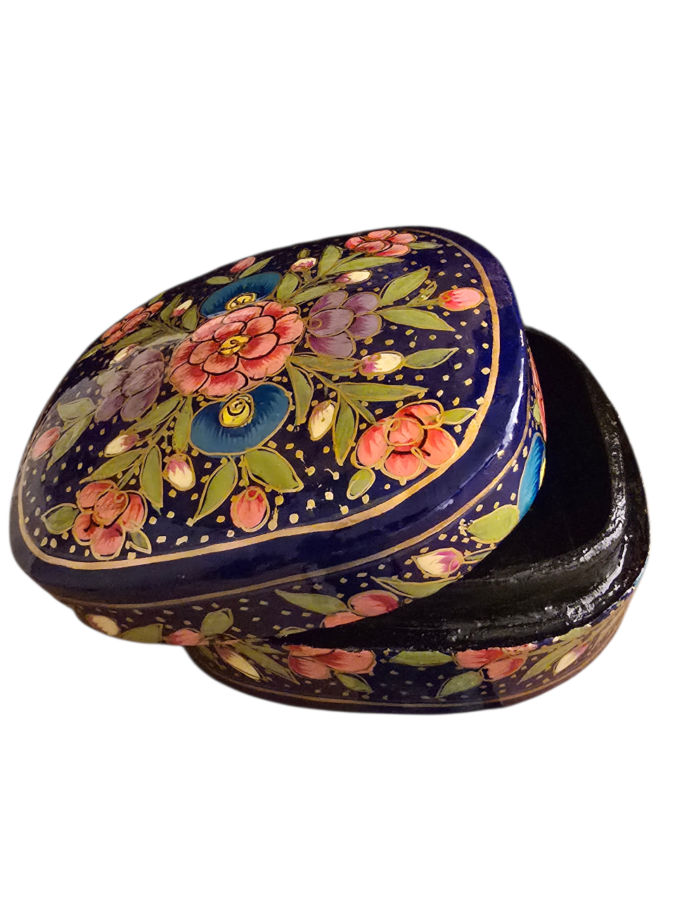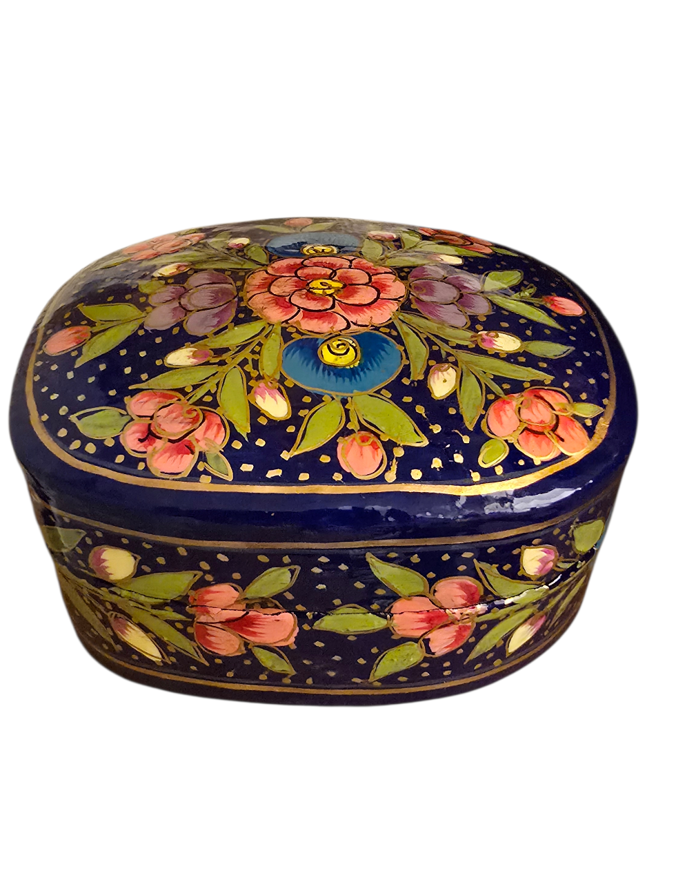 Et flott liten blå boks. Den er håndlaget i papp-maché. Malt og lakkert for hånd. Den perfekte gaven å gi arvesmykket i. Eller venninne gave?