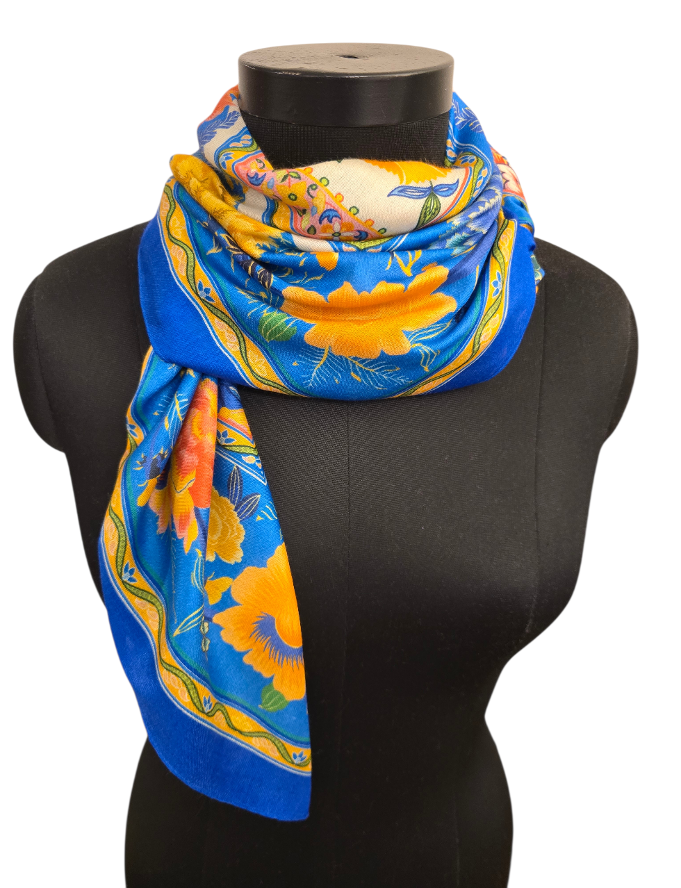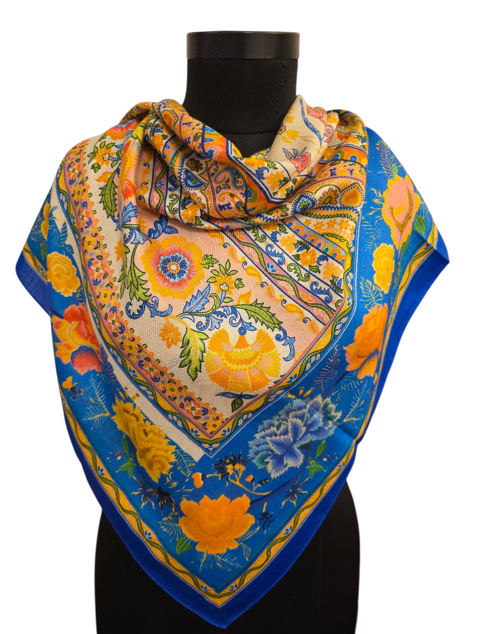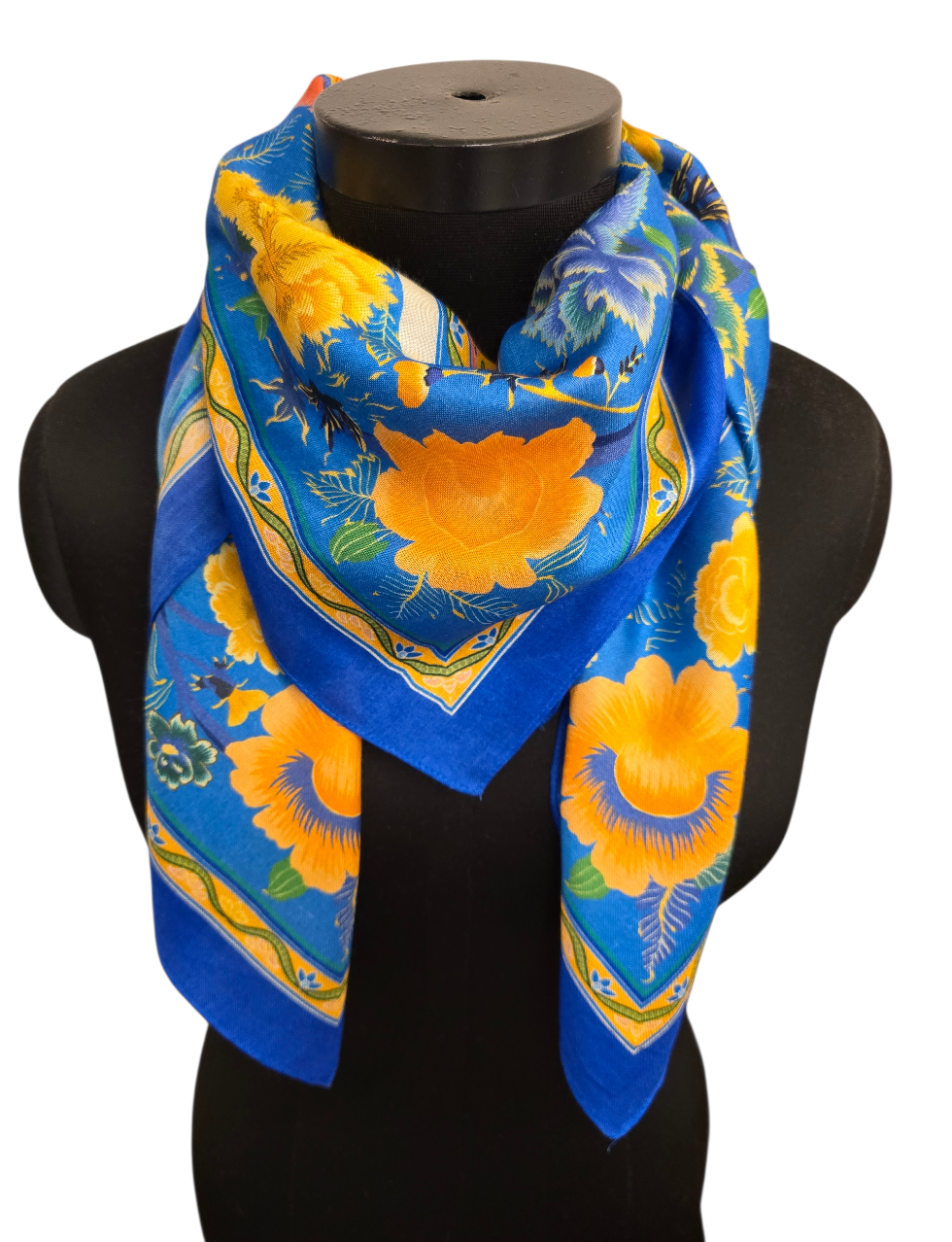 Et særdeles mykt og godt silkeskjerf i flere gule og blå toner.