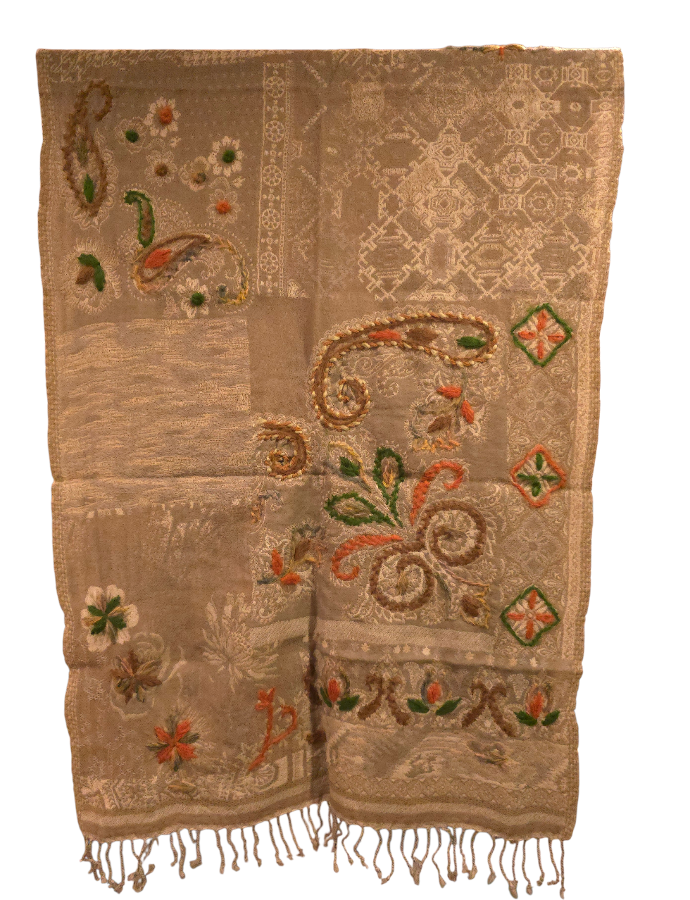 Grå/beige ullskjerf med duse broderier (89)