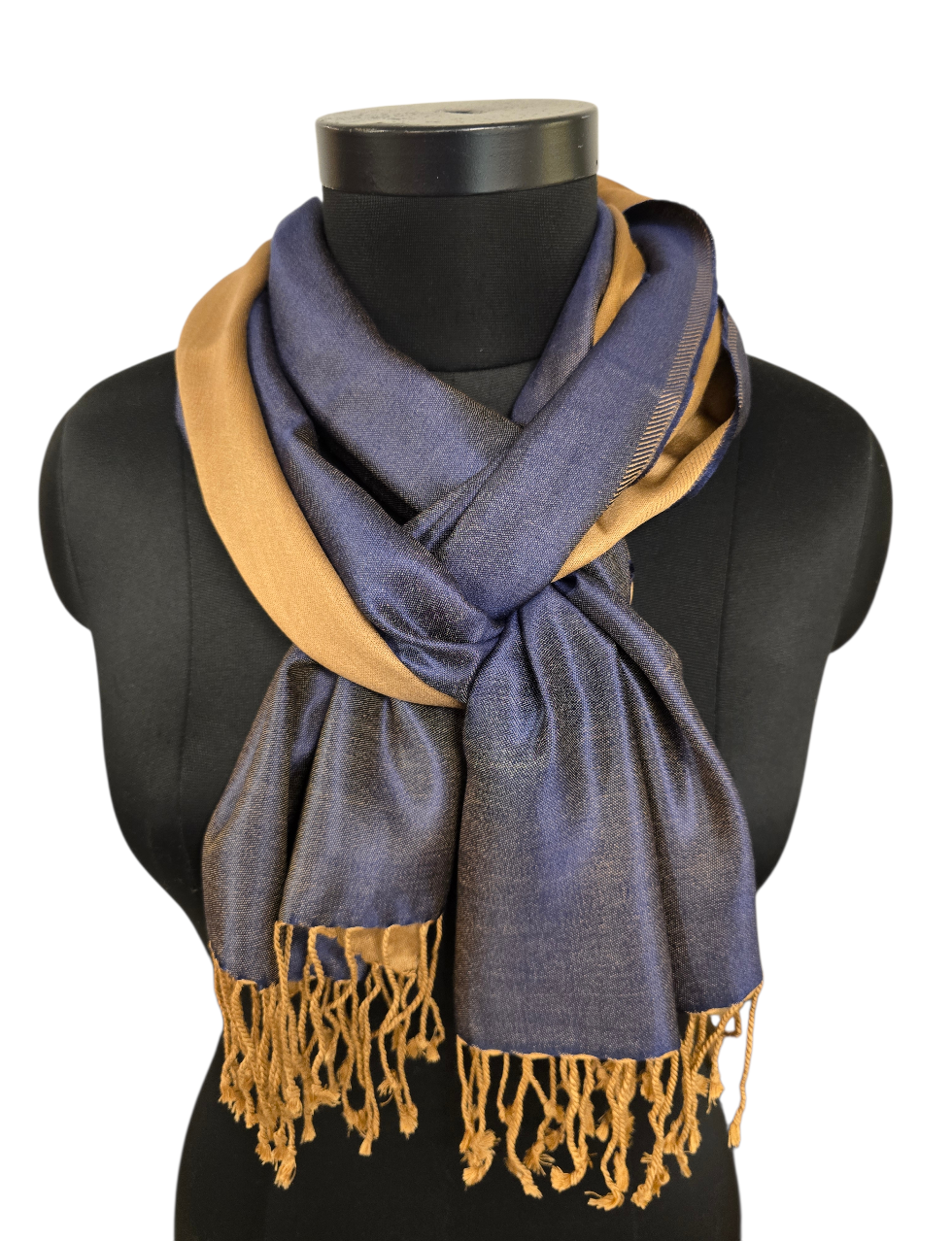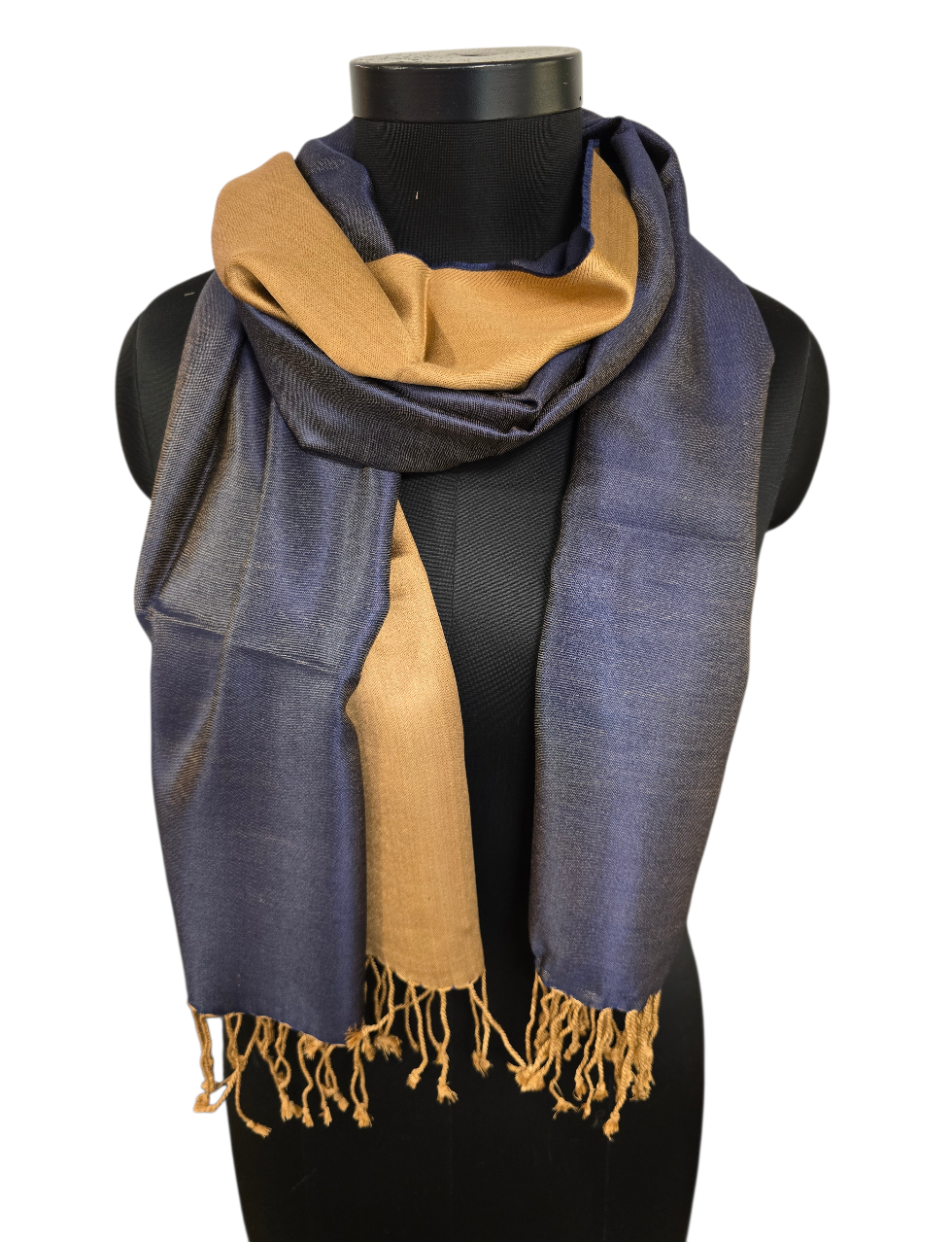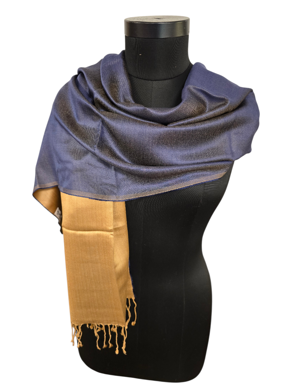 Et lekkert tofarget silkeskjerf. Vi vever vekselsvis marineblått og beige på en beige/gyllen renning. Flott!! Skjerfet veier 105 gram og er som du forstår ikke av den tynne lette typen. Men et skjerf som ligger pent over skuldrene.