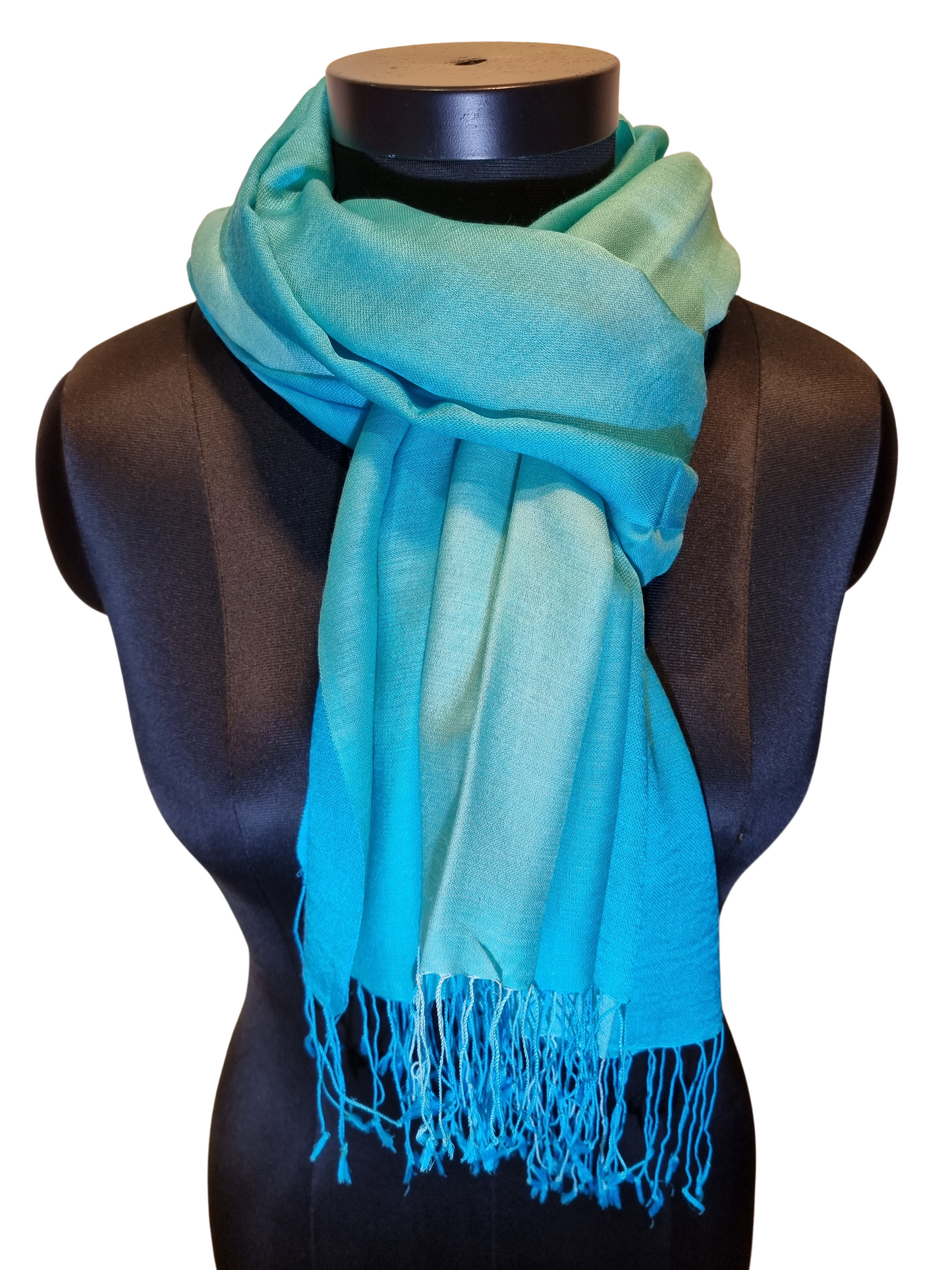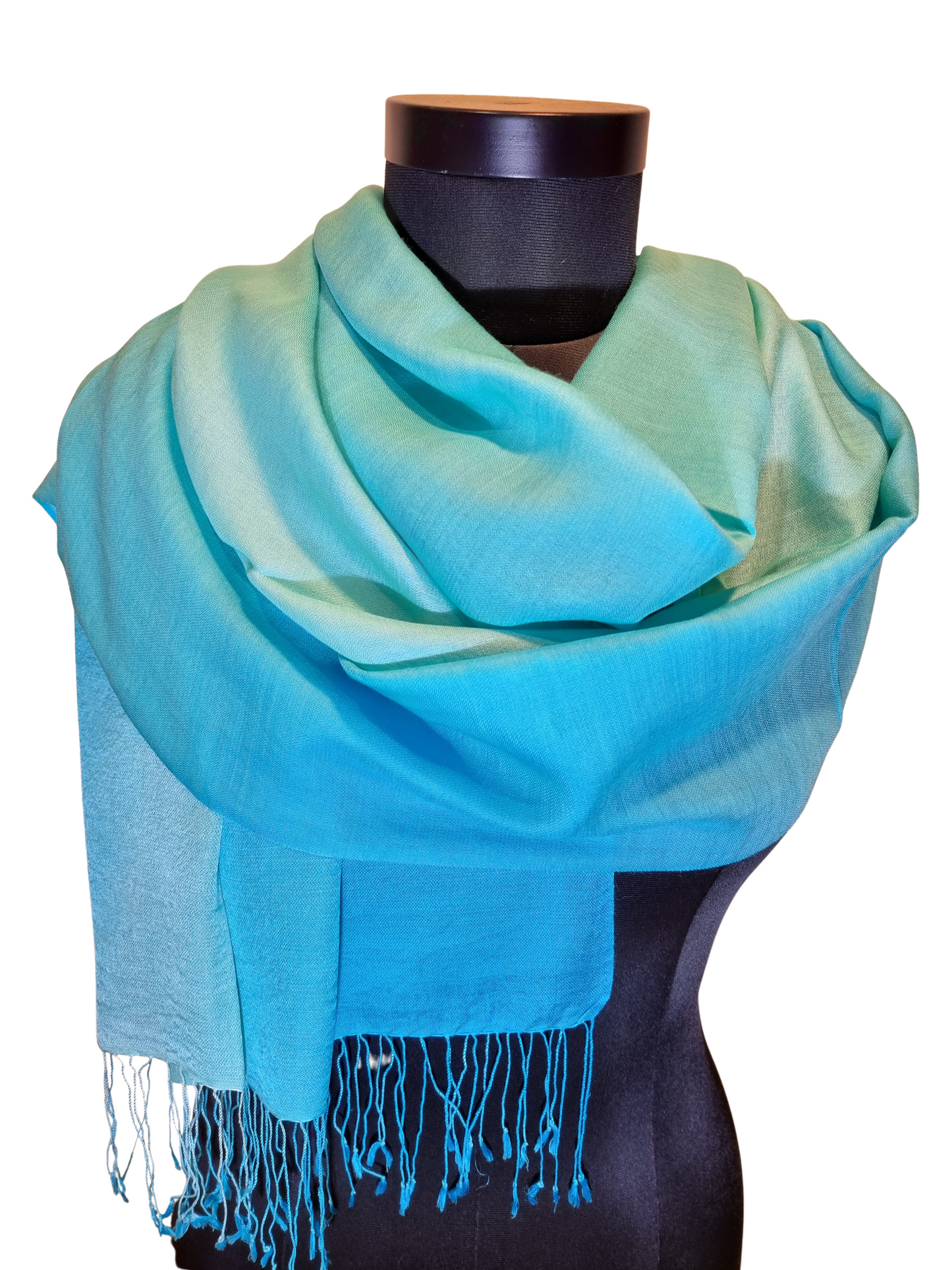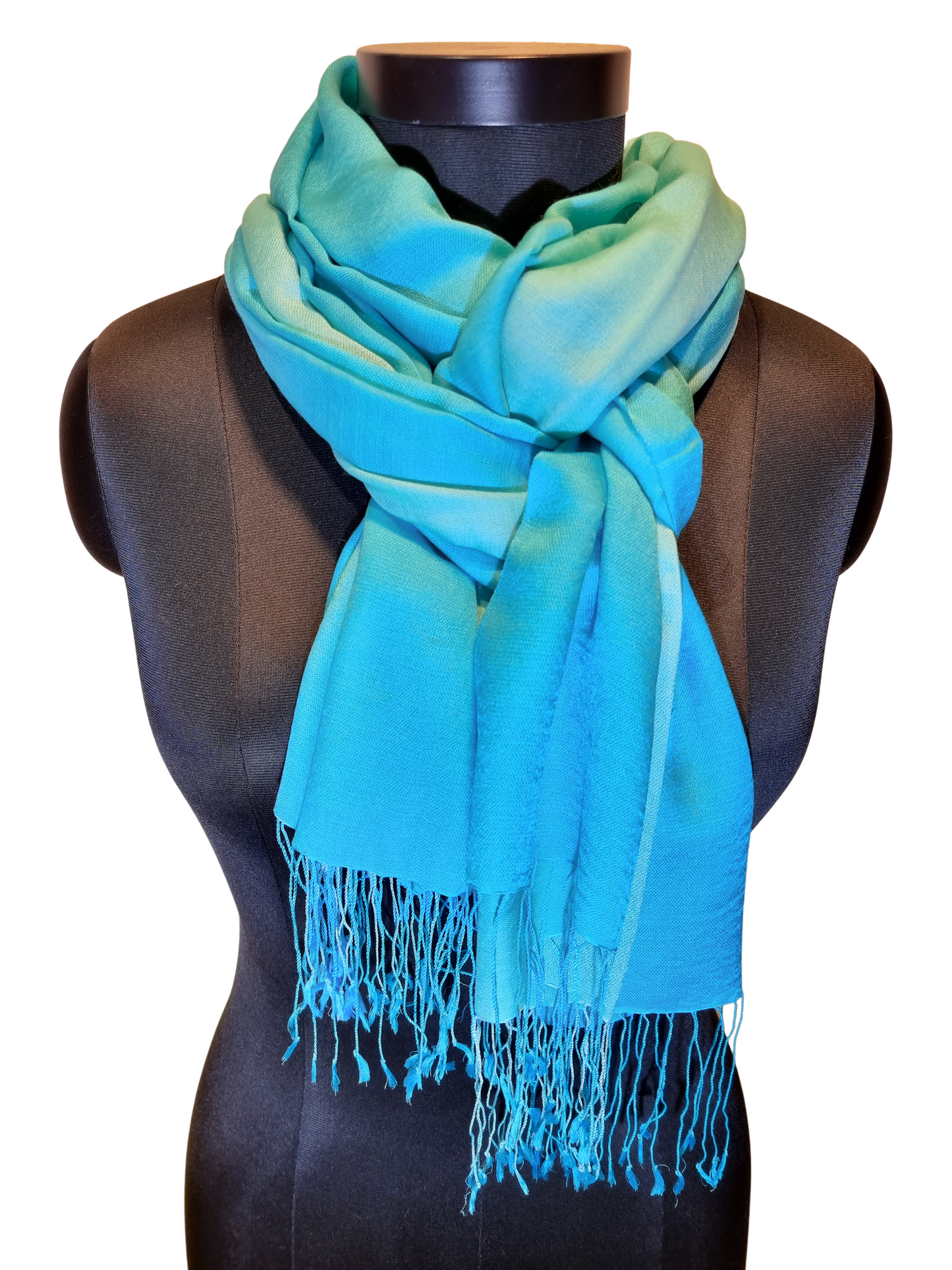 Et friskt og lett skjerf vevet og farget i lys turkis og grønt. Skjerfet er vevet i to farger og så farget forsiktig i to nye farger. Vi får da glidende overganger og et hav av nyanser. Alt gjort for hånd.