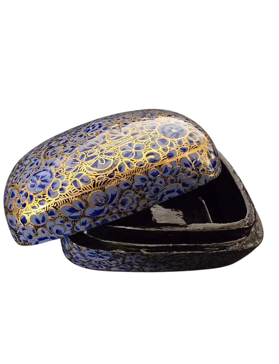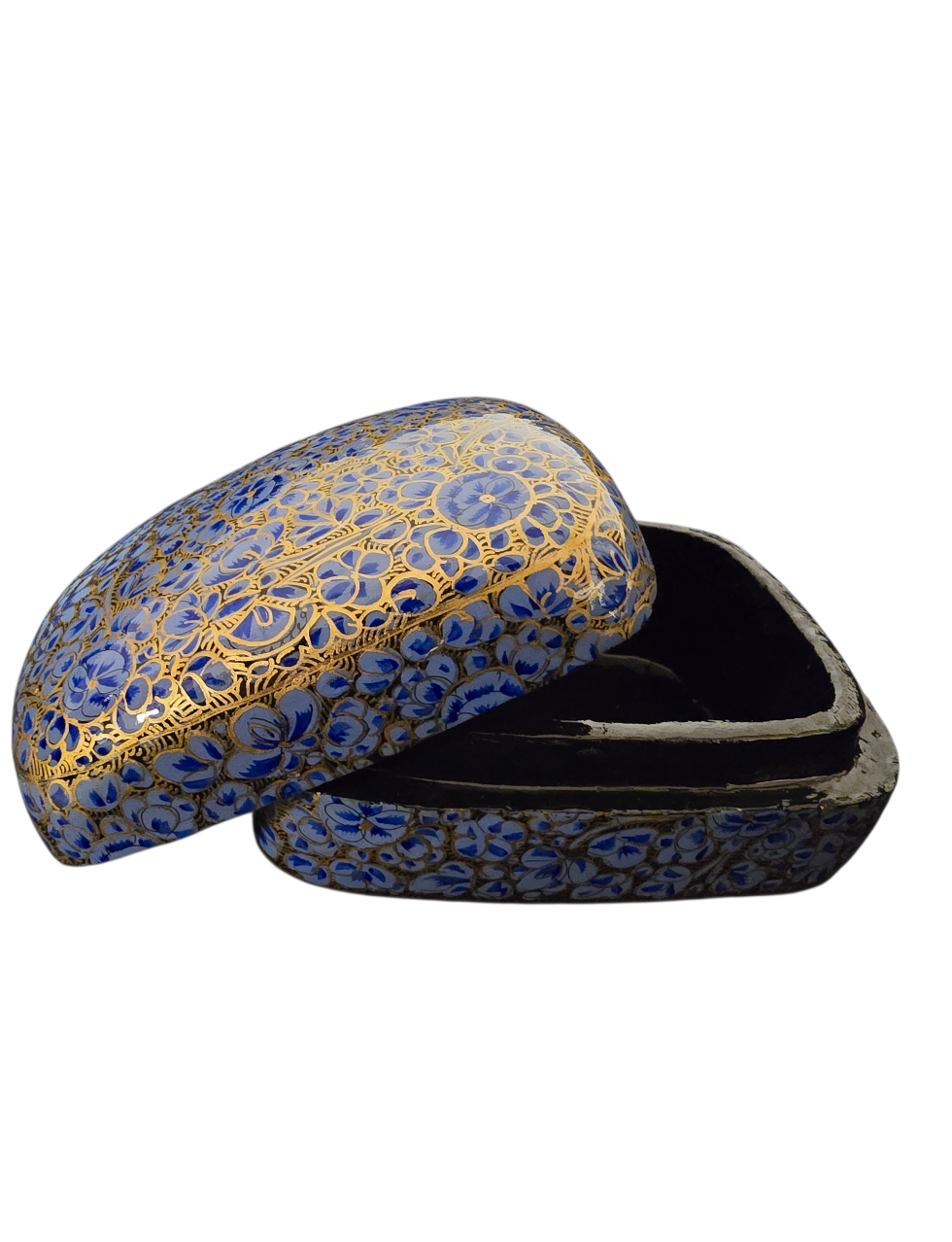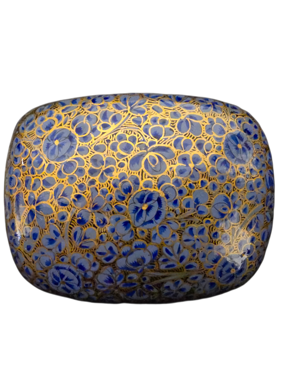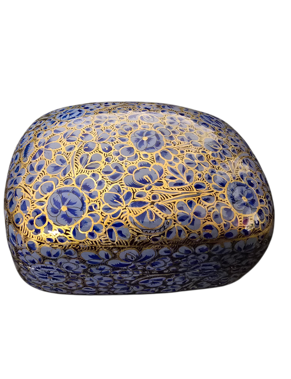 Håndlaget lite lyseblått smykkeskrin med blomstermønster. Skrinet er laget i pappmache, malt og lakkert for hånd.