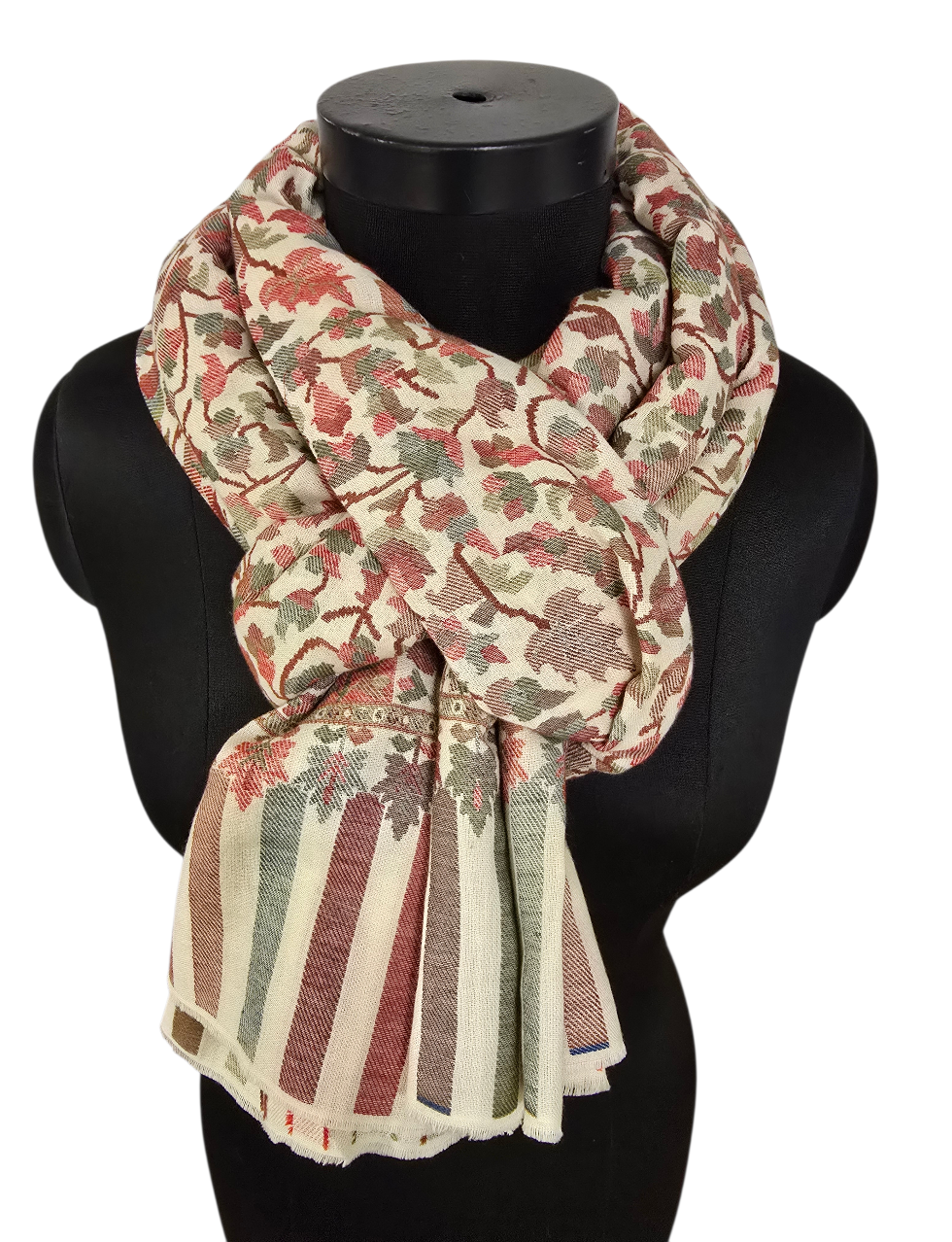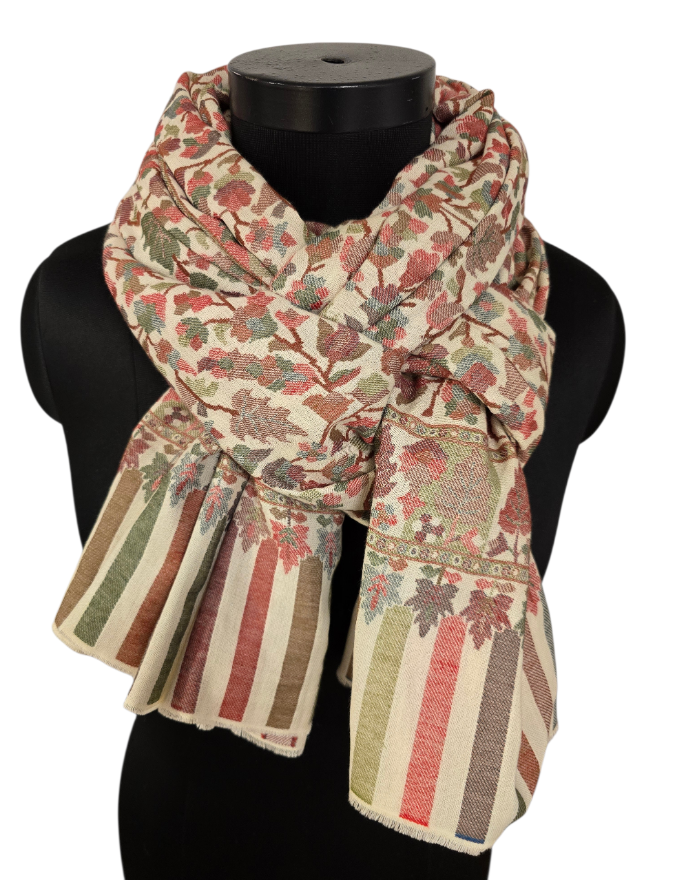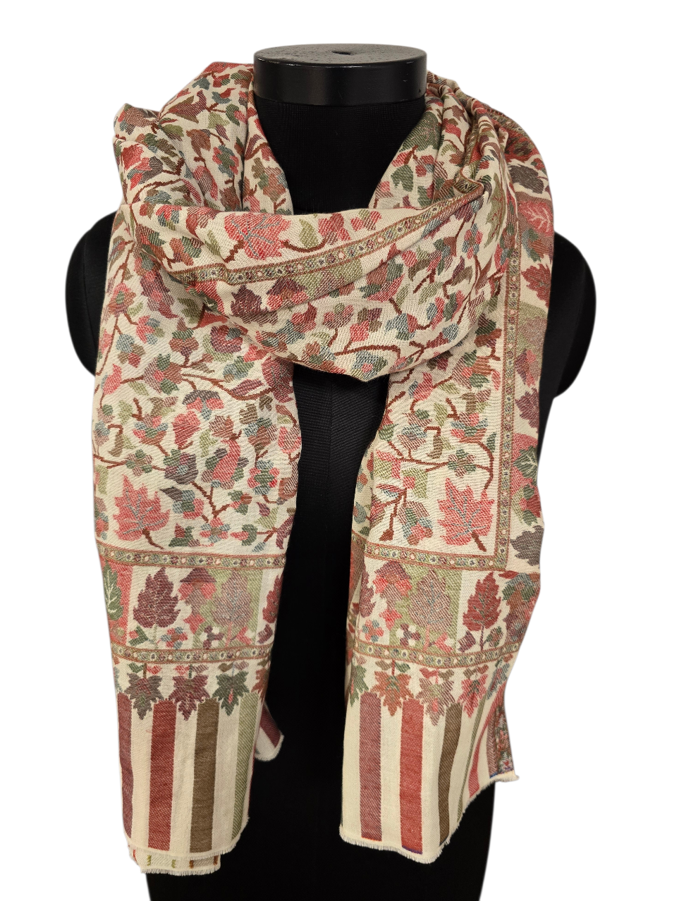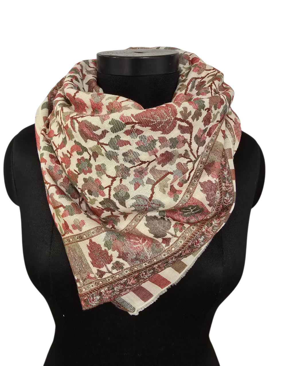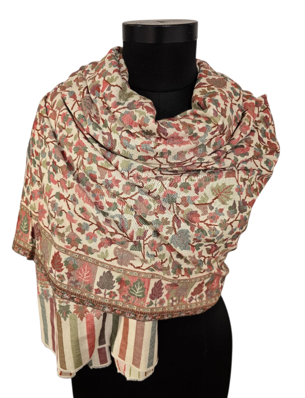 Et kunstverk av et sjal i rolige farger og mønster fra Kashmir. Vevet i en teknikk kalt kani-vev. Samme teknikk som billedvevere benytter. Som betyr at det får en helt annen dybde. Og en bakside.