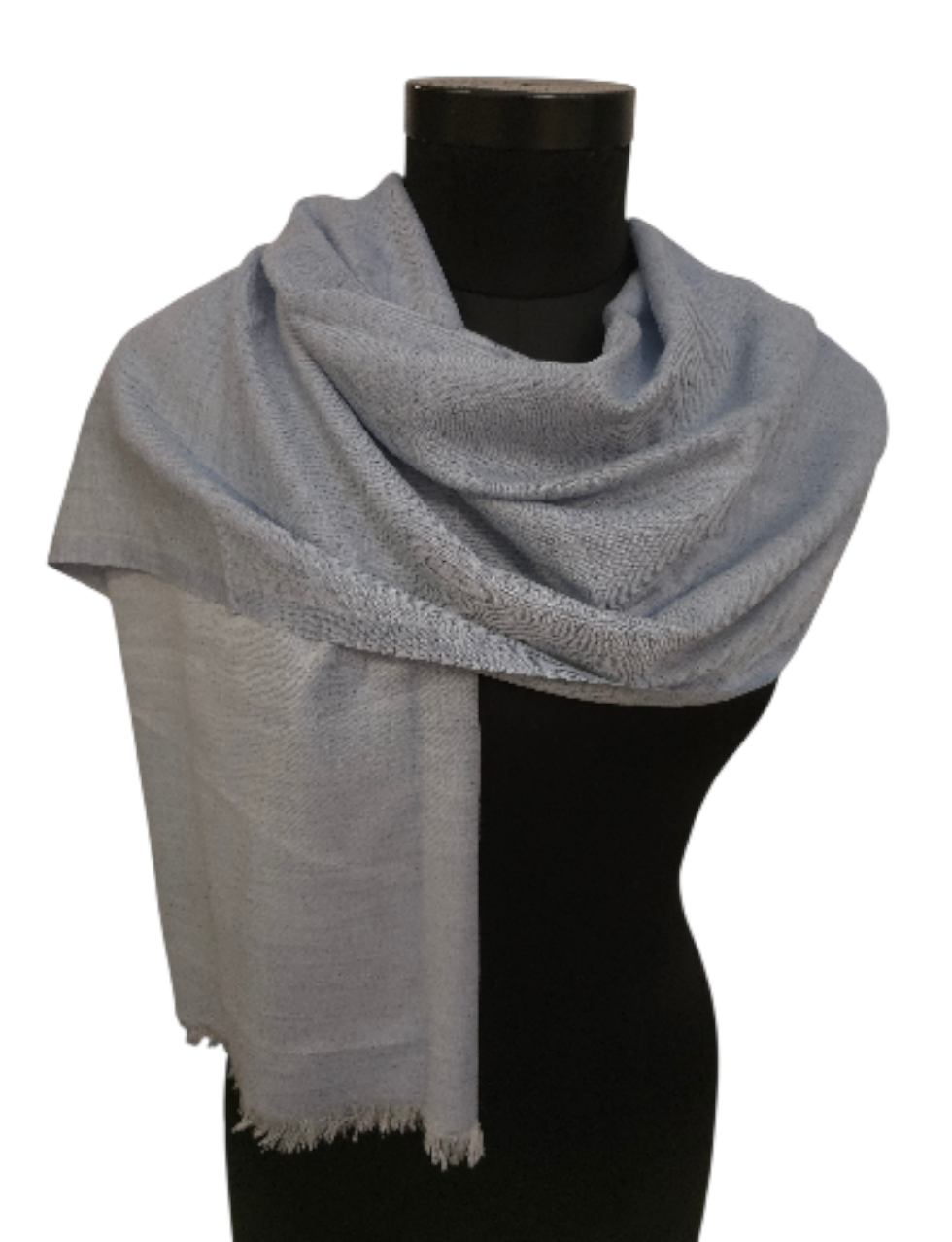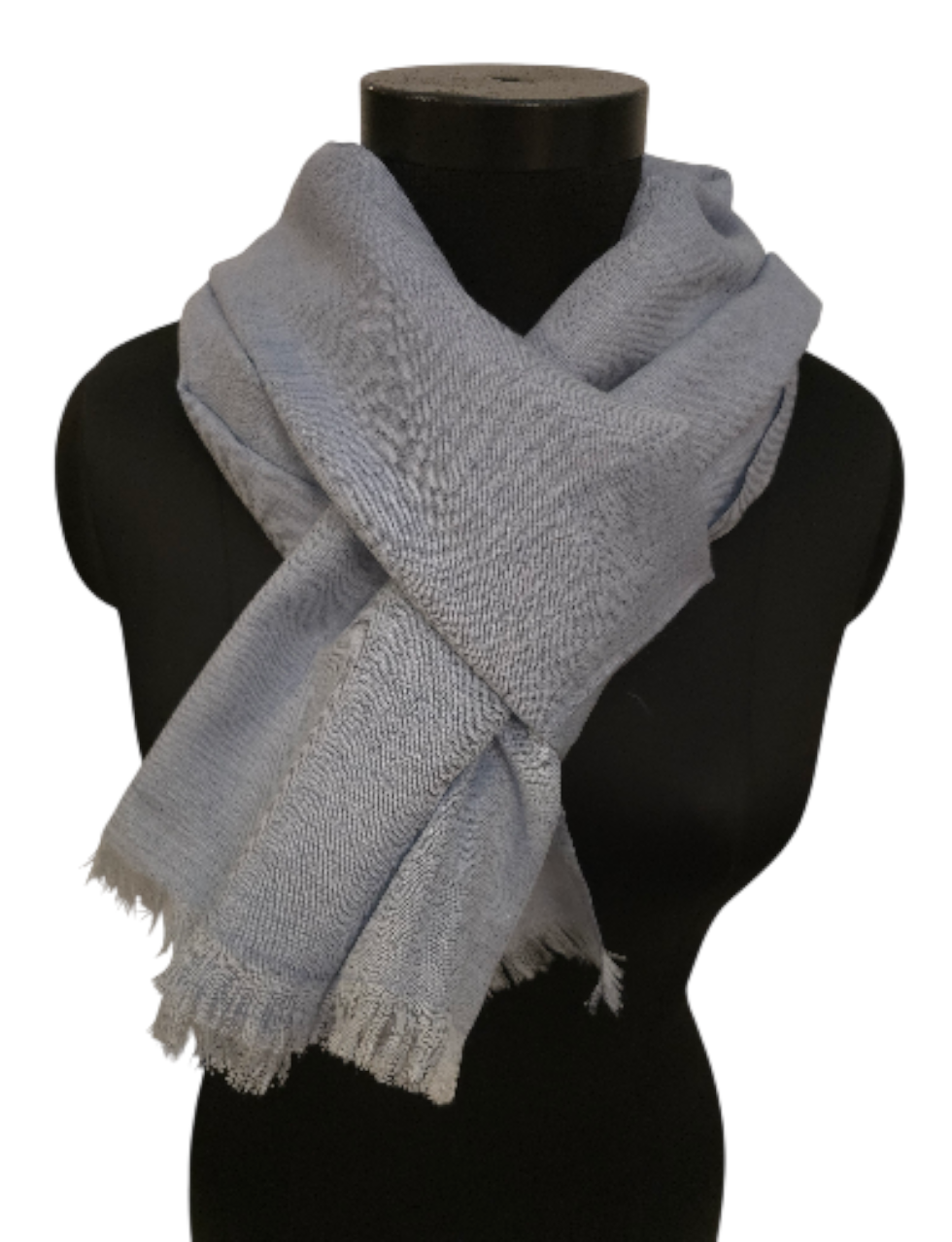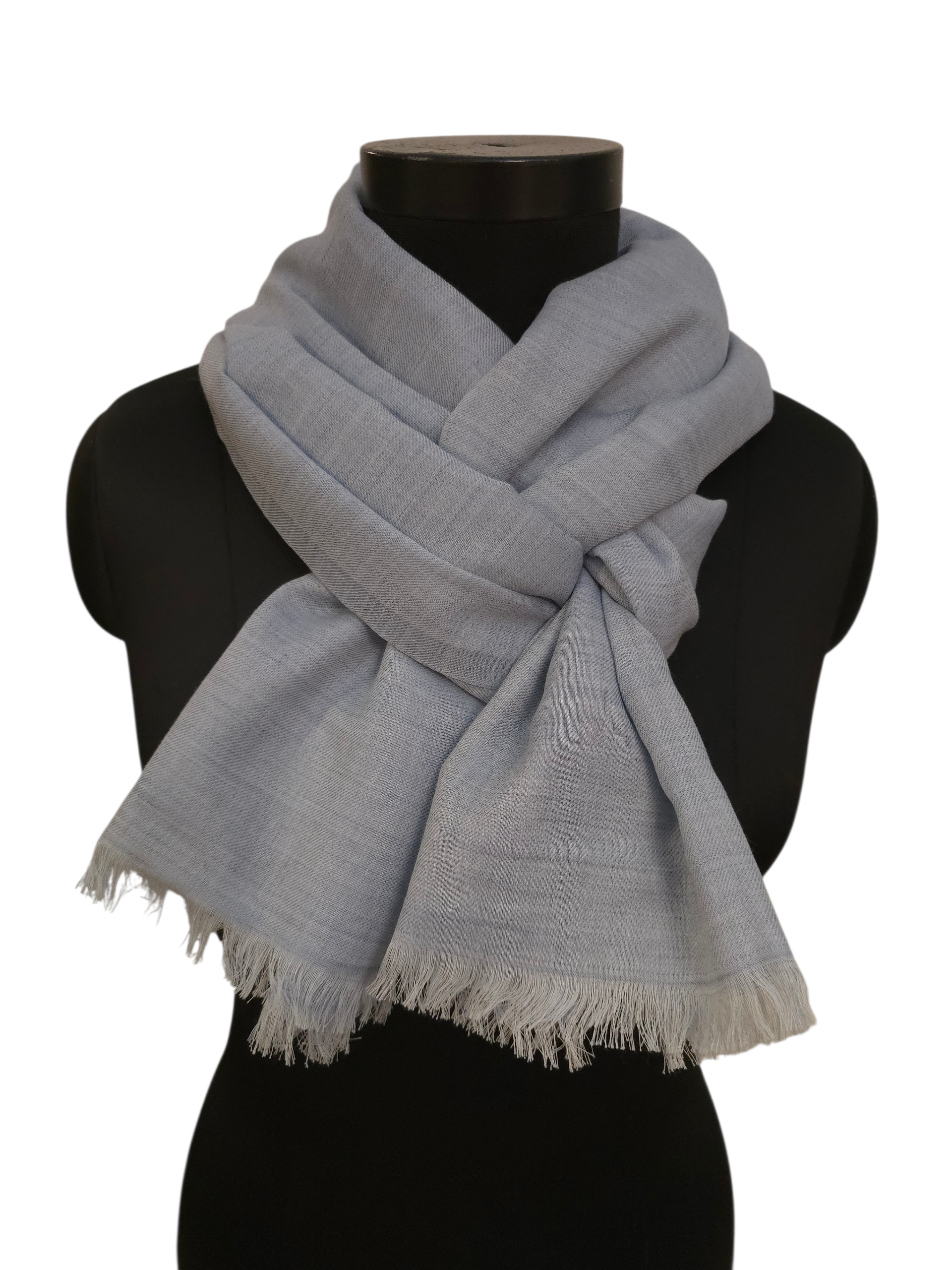 Skjerfet er vevet med lys blå mot det grå tråd på en lys blå renning. Effektfullt.