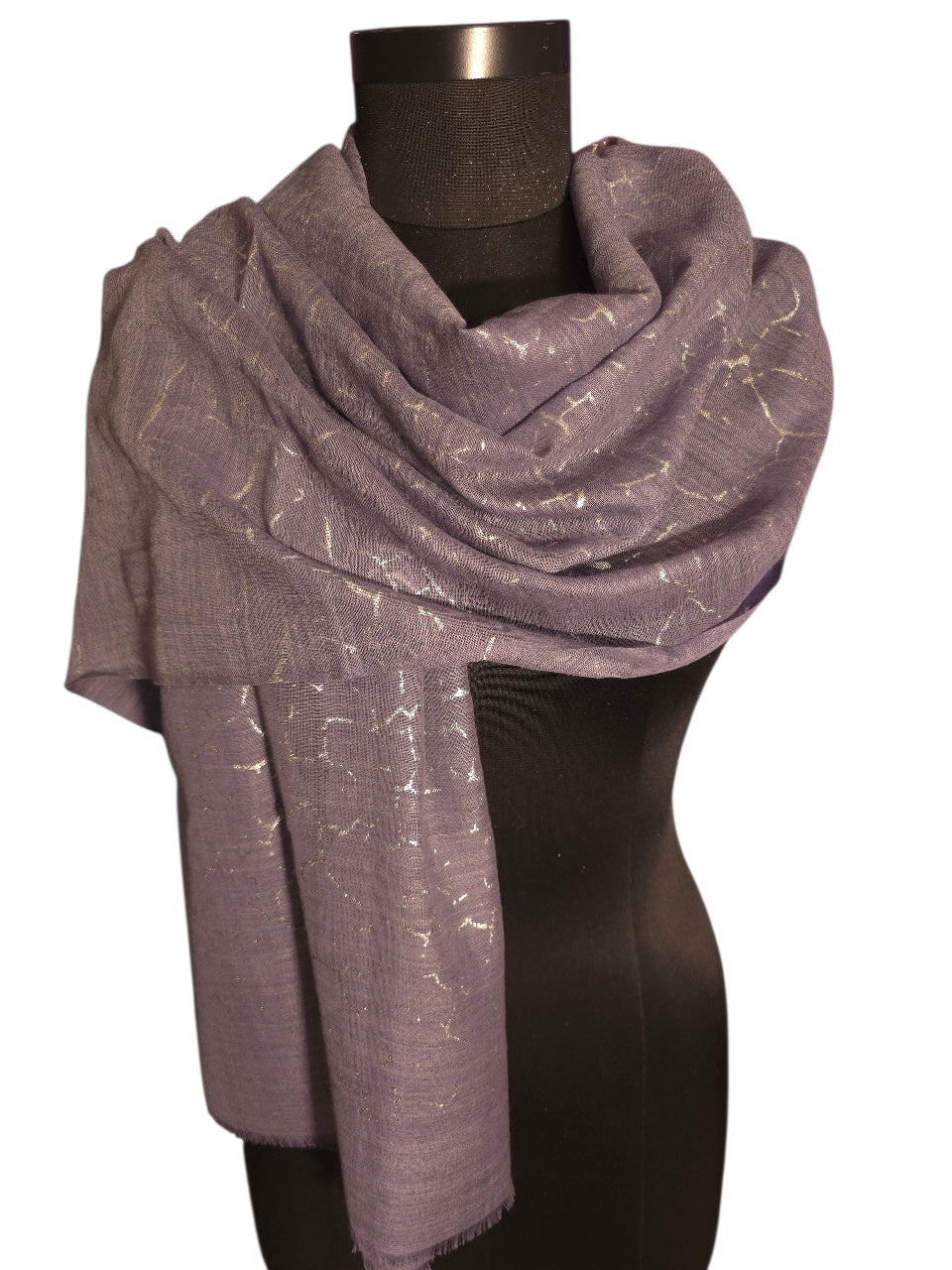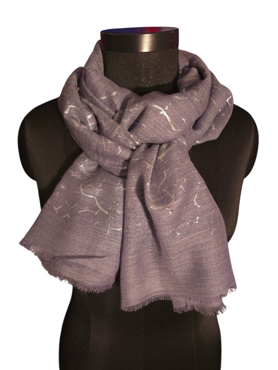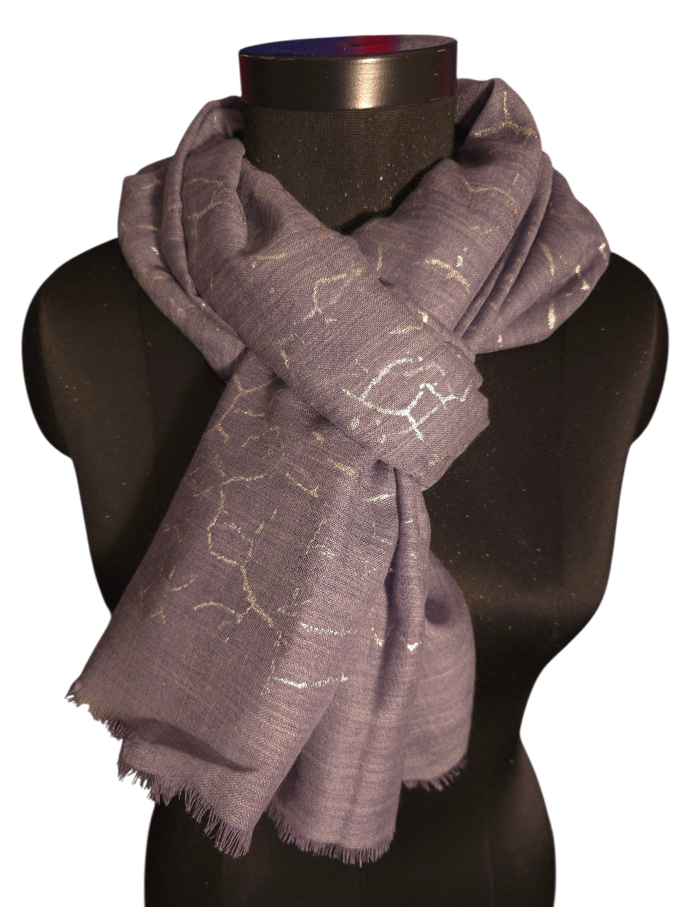 Vi elsker kalde farger. Dette blå mot lilla melerte skjerfet med et sølv aktig trykk er bare så lekkert.