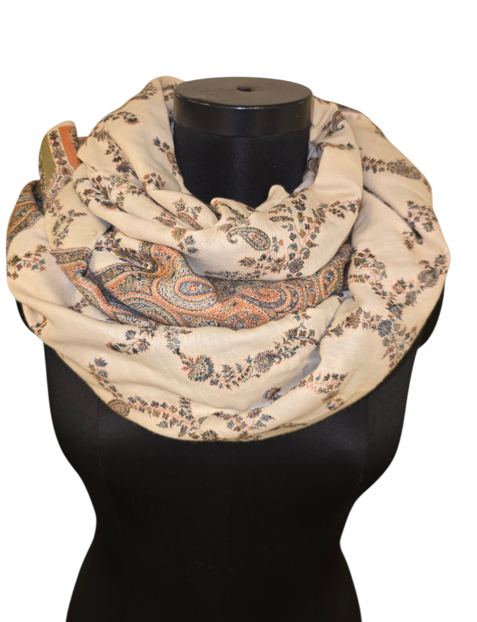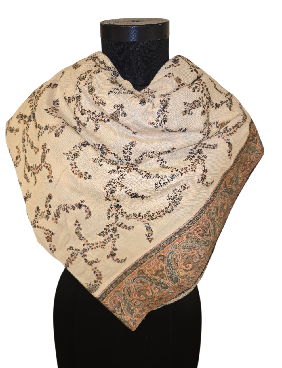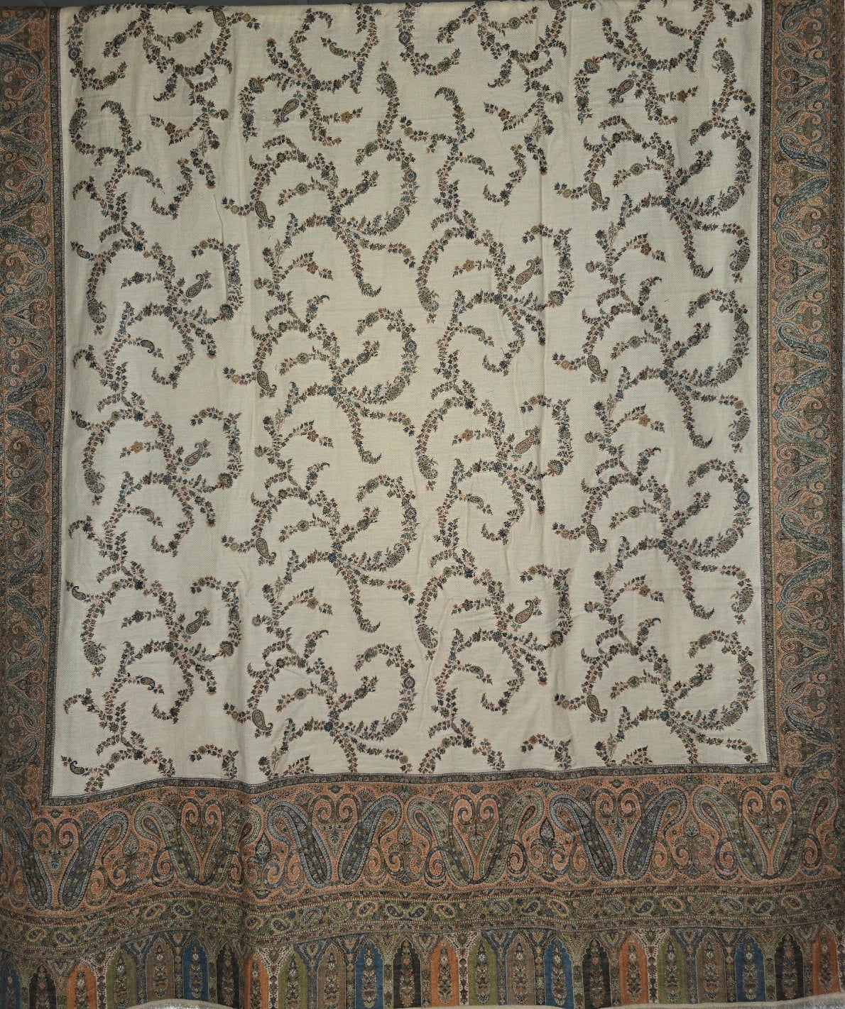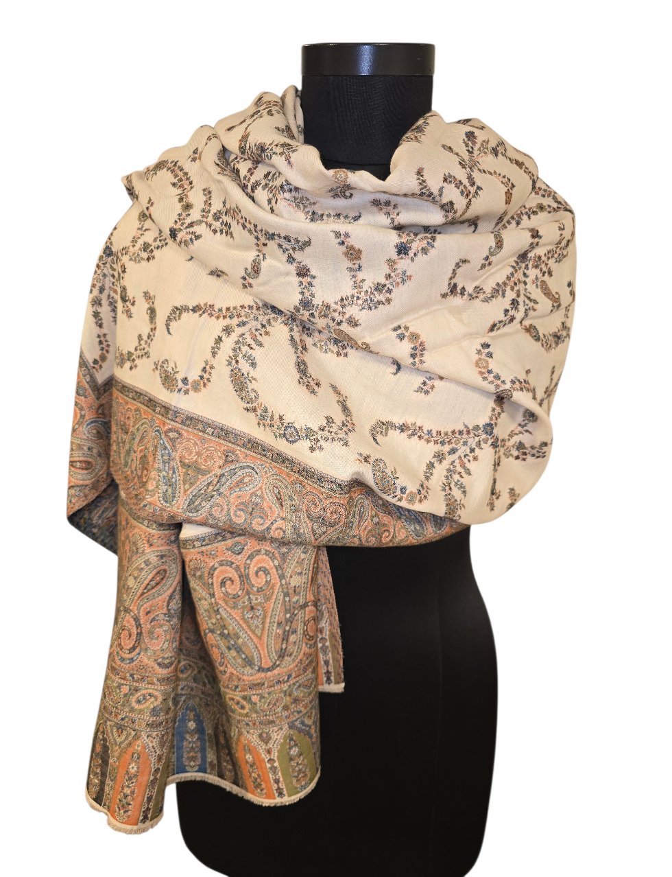 Et kunstverk av et sjal i rolige farger og mønster fra Kashmir. Vevet i en teknikk kalt kani-vev. Samme teknikk som billedvevere benytter. Som betyr at det får en helt annen dybde. Og en bakside.