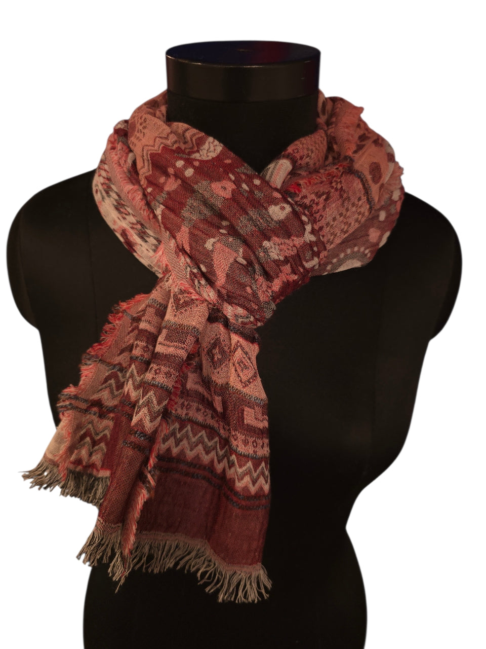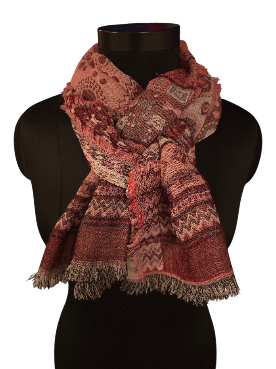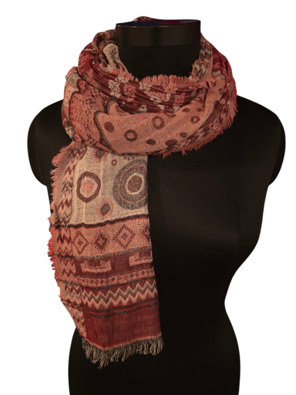 ​Dette luksuriøse skjerfet i 90 % bomull og 10 % silke tilfører varme og eleganse til enhver garderobe. Med sine mål på 45x180 cm byr det på rikelig med volum og mange stylingsmuligheter. Designet kombinerer dype burgundertoner, rustrødt og støvete rosa i et vakkert mønster av etniske border og geometriske figurer. Den myke silkeblandingen gir et eksklusivt preg, mens de grove frynsene langs kantene gir skjerfet en moderne, bohemsk vri som passer perfekt til sesongens kåper.