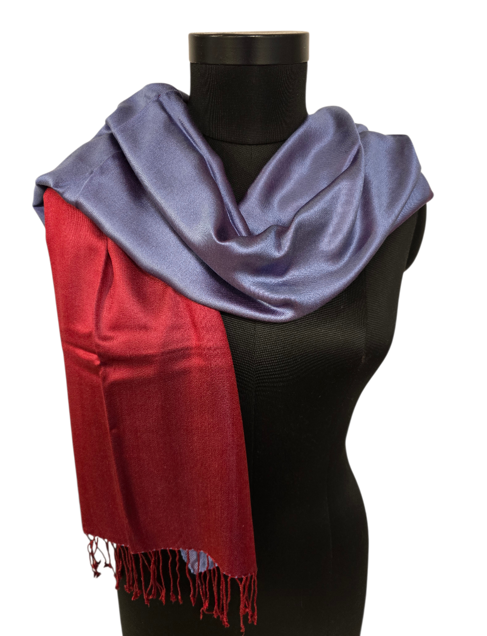 Et lekkert tofarget silkeskjerf. Vi vever vekselsvis blått og rødt på en rød renning. Skjerfet veier 105 gram og er som du forstår ikke av den tynne lette typen. Men et skjerf som ligger pent over skuldrene.