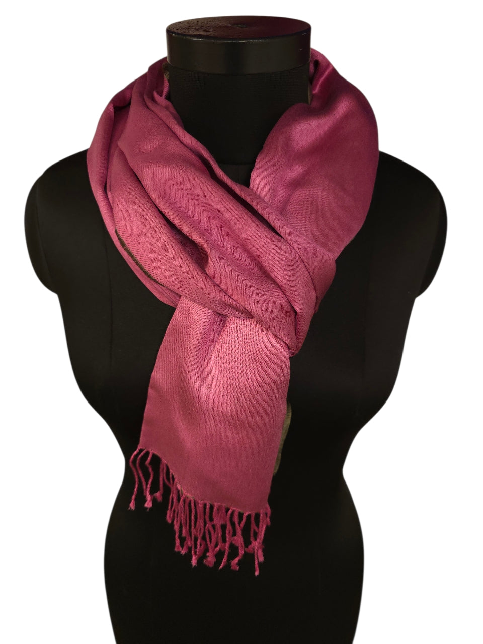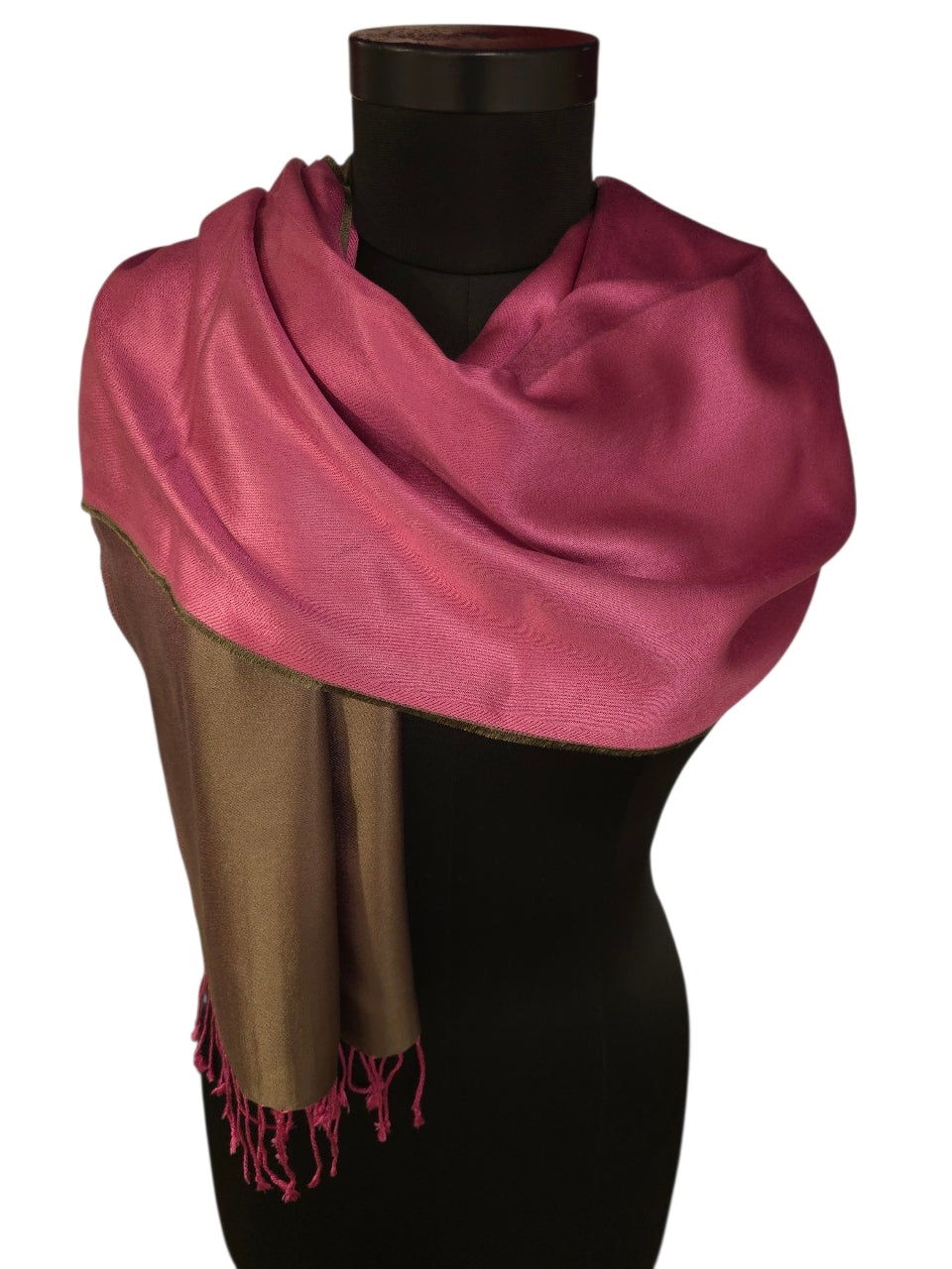 Et lekkert tofarget silkeskjerf. Denne gangen i en kombinasjon av brunt og lys rosa farger med rosa frynser. Flott!! Skjerfet veier 105 gram og er som du forstår ikke av den tynne lette typen. Men et skjerf som ligger pent over skuldrene.