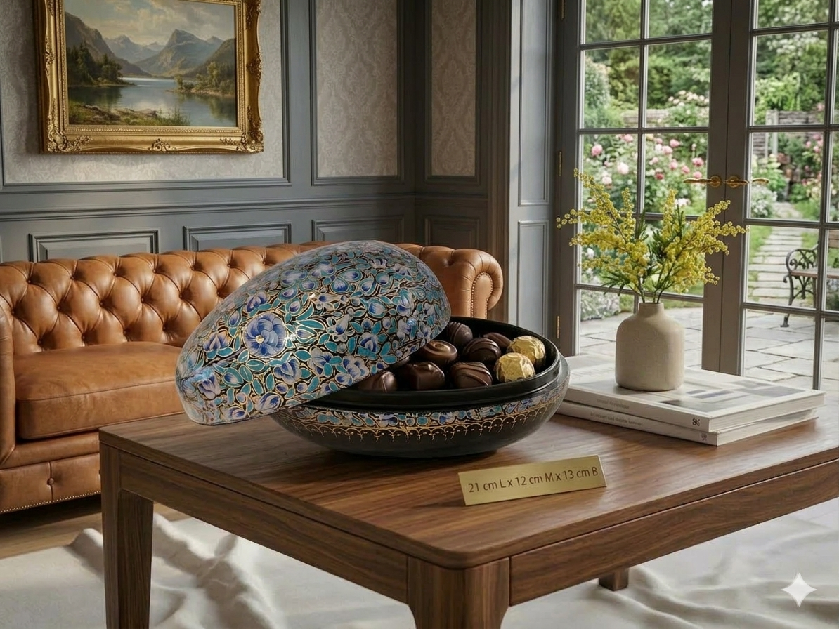 Dette er en sterk håndverkstradisjon i Kashmir. Egget veier faktisk 1 kilo og står støtt på et bord som en nydelig dekorasjon, uansett hva du ønsker å fylle det med...