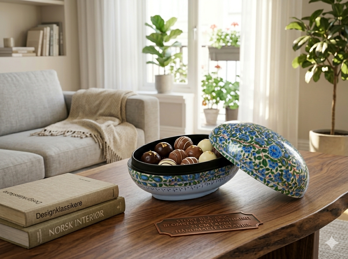 Dette er en sterk håndverkstradisjon i Kashmir. Egget veier faktisk en halv kilo og står støtt på et bord som en nydelig dekorasjon, uansett hva du ønsker å fylle det med...