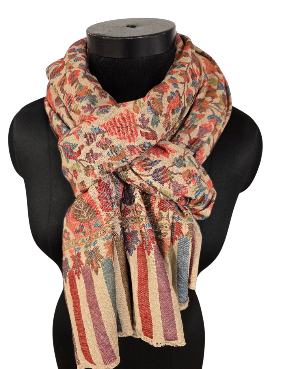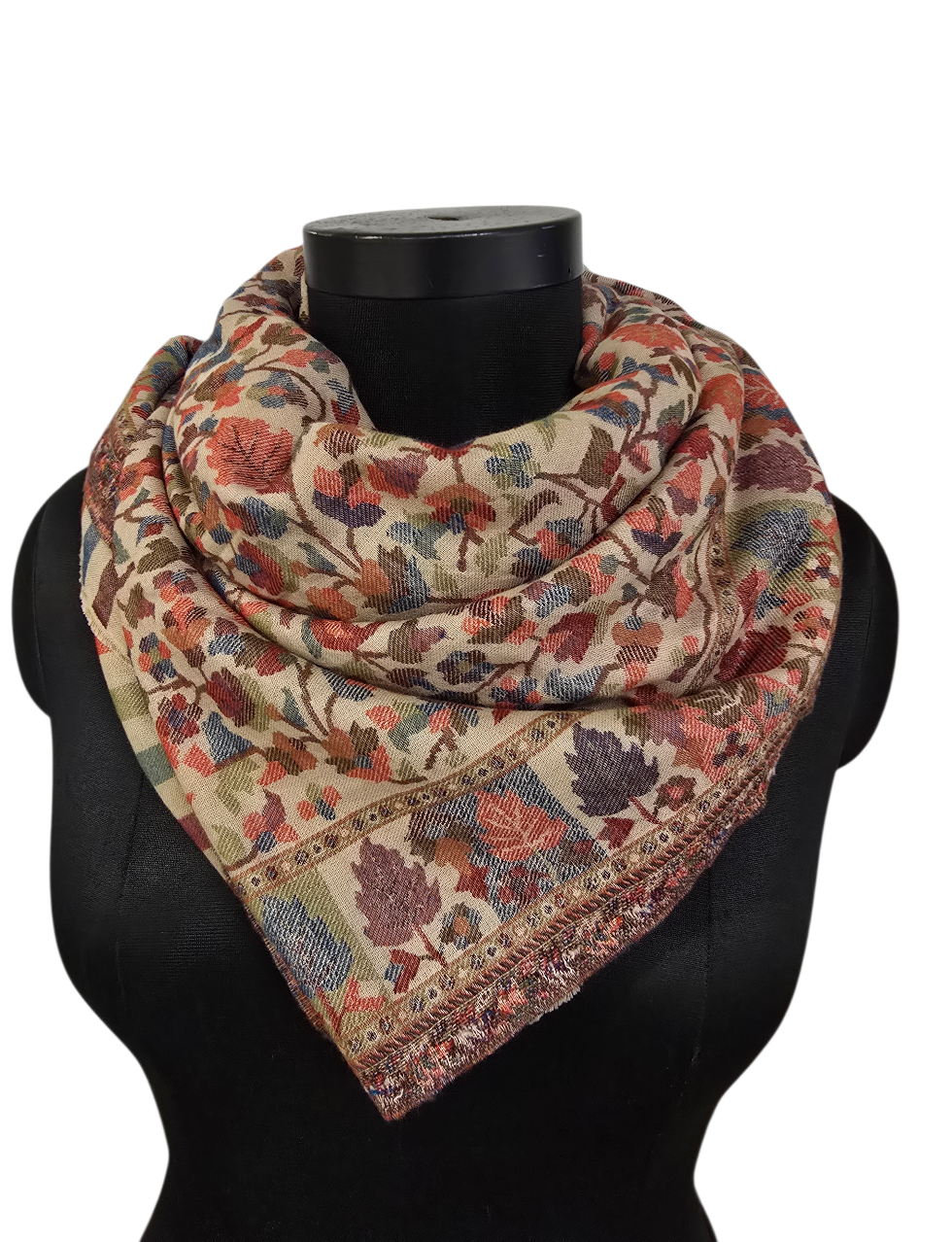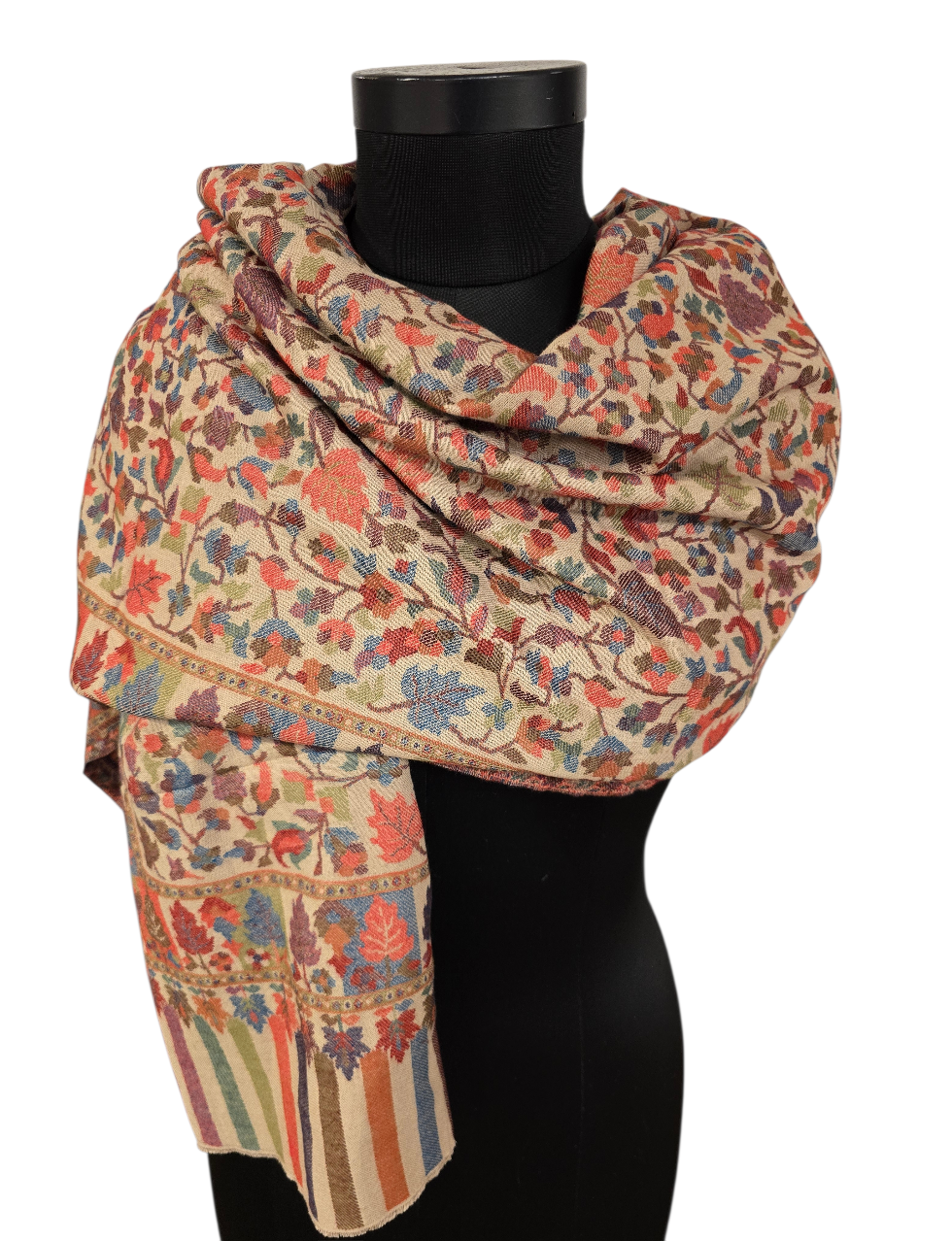 Et kunstverk av et sjal i rolige farger og mønster fra Kashmir. Vevet i en teknikk kalt kani-vev. Samme teknikk som billedvevere benytter. Som betyr at det får en helt annen dybde. Og en bakside.